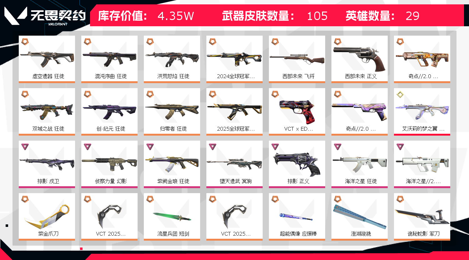 在线秒结,轻点炸鱼,不要挂机,封了都完不了;紫金爪刀,VCT 2025 爪刀,虚空遗器 狂徒,掠影 戍卫,洪荒怒焰 狂徒,侦察力量 幻影,紫阙金琅 狂徒,