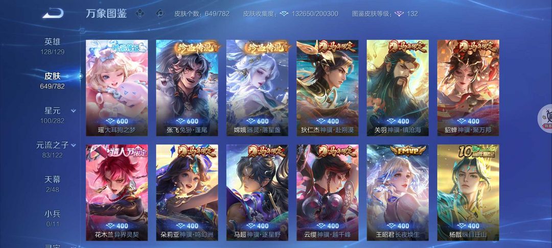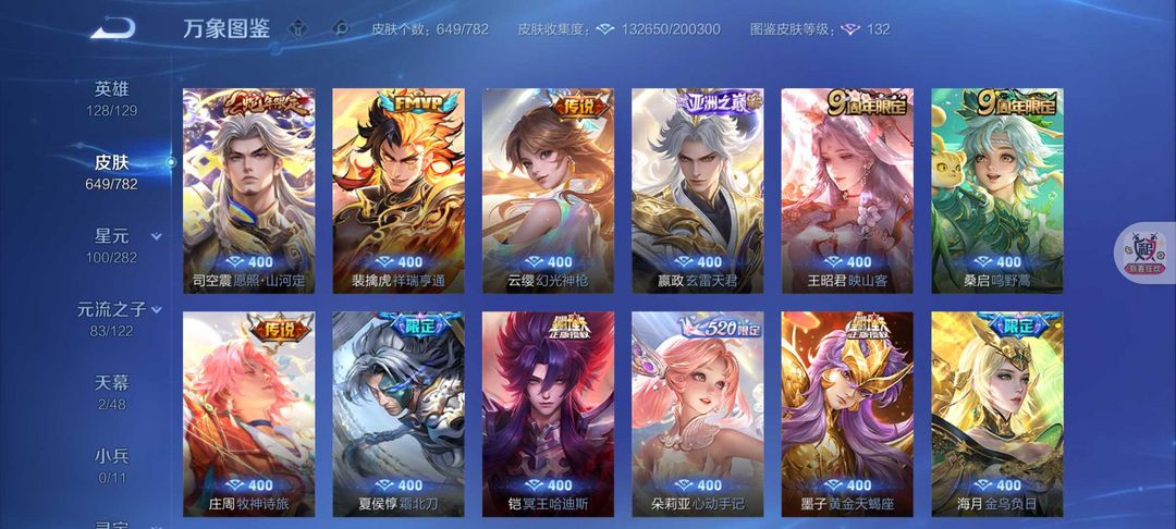 扫码登录。VIP10。385皮肤,七水,四星元,双王者之证!武则天神域,李白荣耀典藏,全息碎影,全符文,各种限定,各种机甲,皮肤都有,绝对满足各位