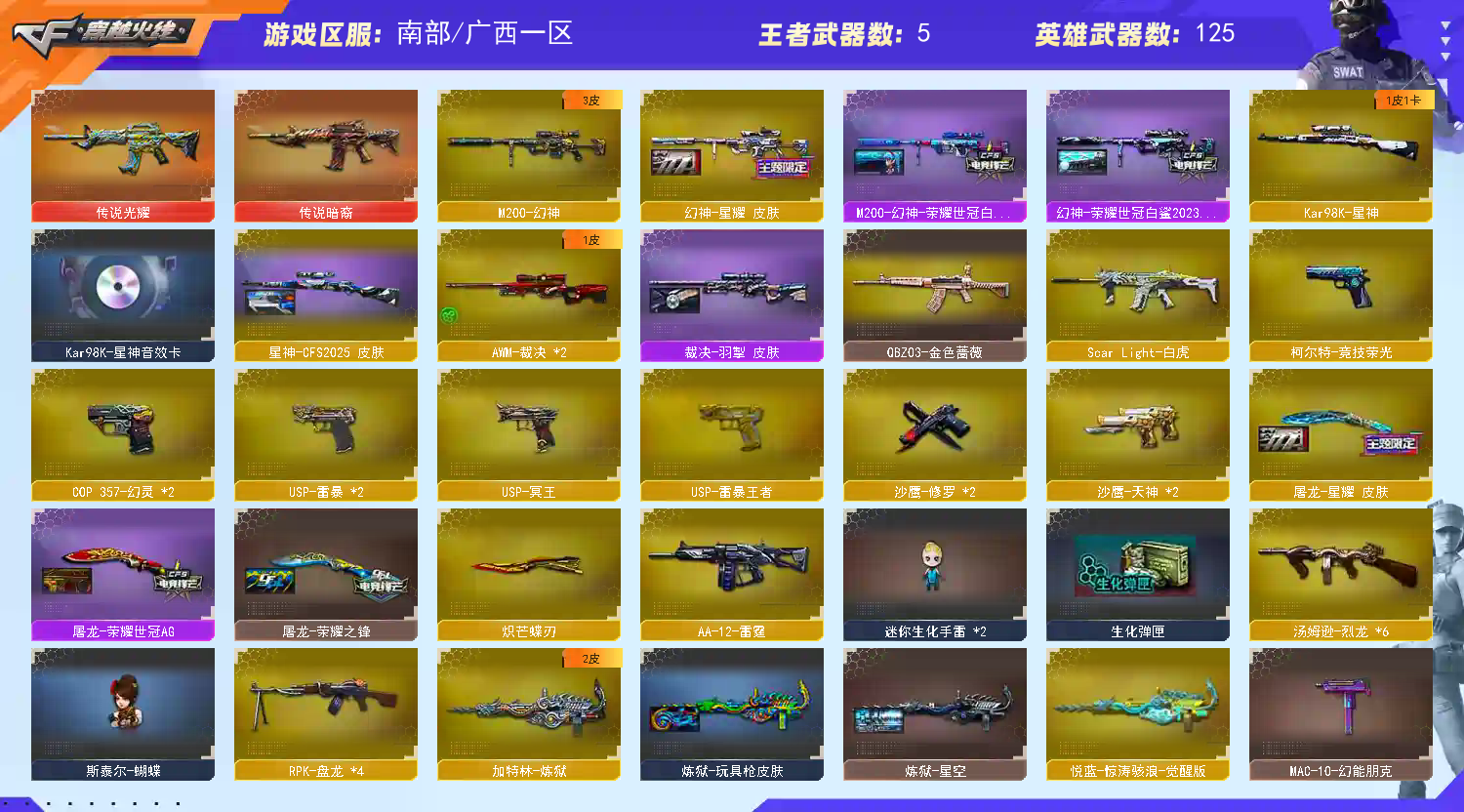 生化爆破号125武器5王者音效卡星神屠龙幻神雷神;USP-雷暴,USP-雷暴王者,炽芒蝶刃,电竞教官-云悠悠,RPK-盘龙,QBZ03-金色蔷薇,M200-幻神,