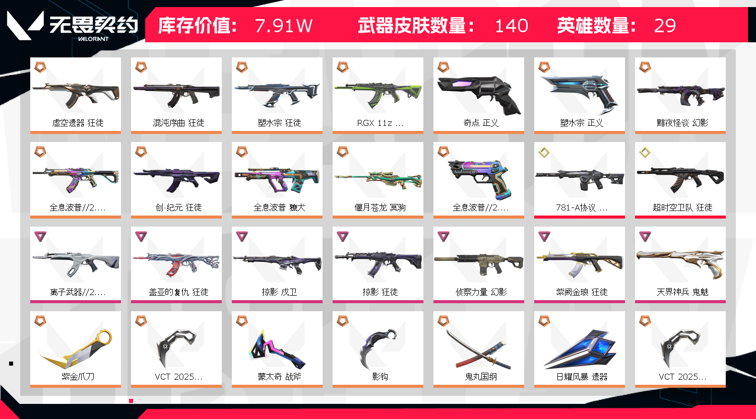 ❤️❤️❤️账号库存价值较大,已做大额虚拟资产备案,开挂盗号等行为报案处理,请不要以身试法。 ❤️❤️❤️禁止游戏内挂机违者拉黑公示,喜欢本账号请点收藏★方便下次租用,谢谢光临惠顾❤️❤️❤️账号库存价值较大,已做大额虚拟资产备案,开挂盗号等行为报案处理,请不要以身试法。 ❤️❤️❤️禁止游戏内挂机违者拉黑公示,喜欢本账号请点收藏★方便下次租用,谢谢光临惠顾❤️❤️❤️账号库存价值较大,已做大额虚拟资产备案,开挂盗号等行为报案处理,请不要以身试法。 ❤️❤️❤️禁止游戏内挂机违者拉黑公示,喜欢本账号请点收藏★方便下次租用,谢谢光临惠顾;紫金爪刀,VCT 2025 爪刀,盖亚的复仇 狂徒,虚空遗器 狂徒,掠影 戍卫,掠影 狂徒,侦察力量 幻影,