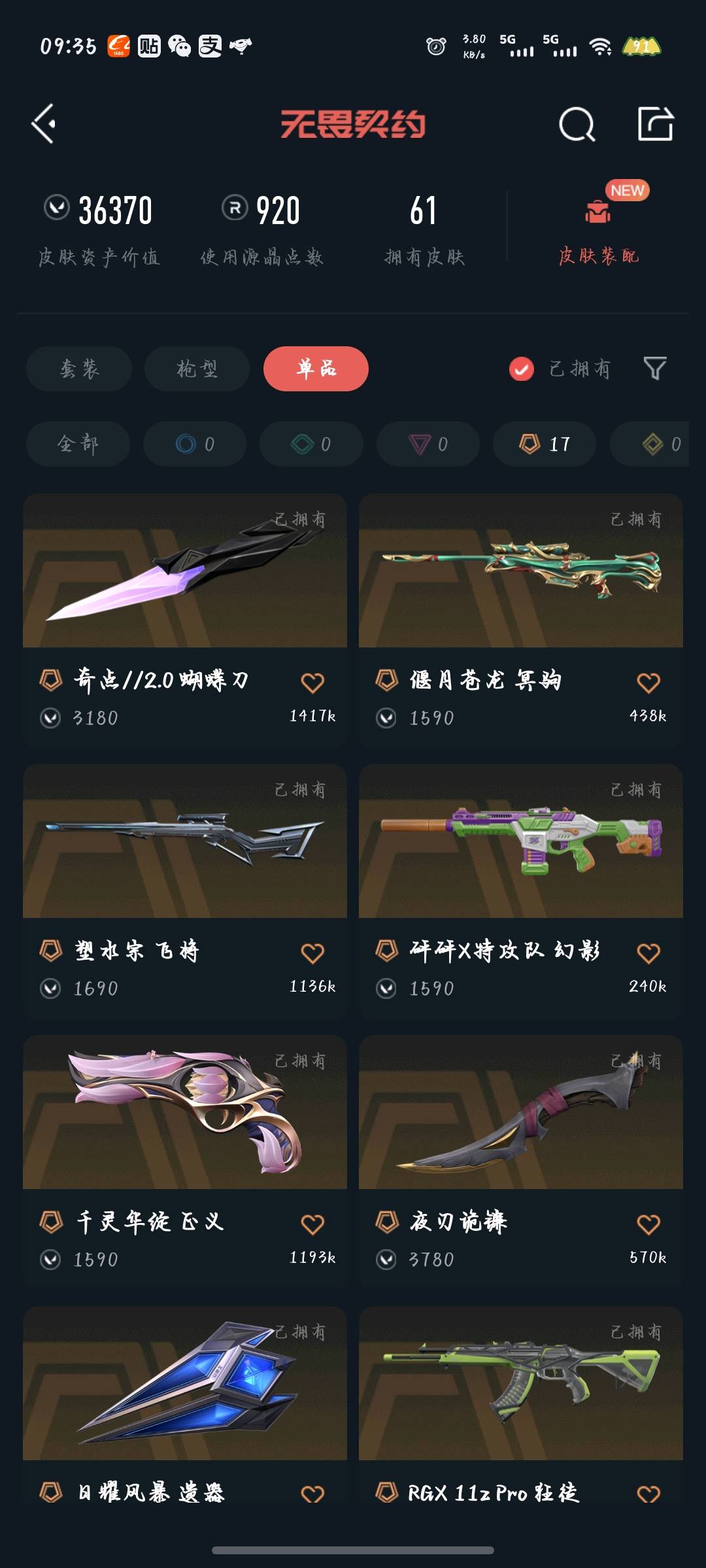 近战武器-RGX11zPro2.0蝴蝶刀,奇点2.0蝴蝶刀,夜刃诡镰,威龙之刃,诡秘蛇影军刀,神圣领域战刀 鬼魅-奇点2.0 正义-千灵华绽 狂徒-塑水宗,混沌序曲,RGX11zPro,盖亚的复仇,紫阙金琅 幻影-砰砰X特攻队,黯夜怪谈 冥驹-偃月苍龙 飞将-塑水宗 奥丁-西部未来 骇灵-艾沃莉的梦之翼 戍卫-紫阙金琅 战神-盖世英雄;西部未来 奥丁,威龙之刃,盖亚的复仇 狂徒,紫阙金琅 狂徒,RGX 11z Pro 狂徒,混沌序曲 狂徒,塑水宗 狂徒,