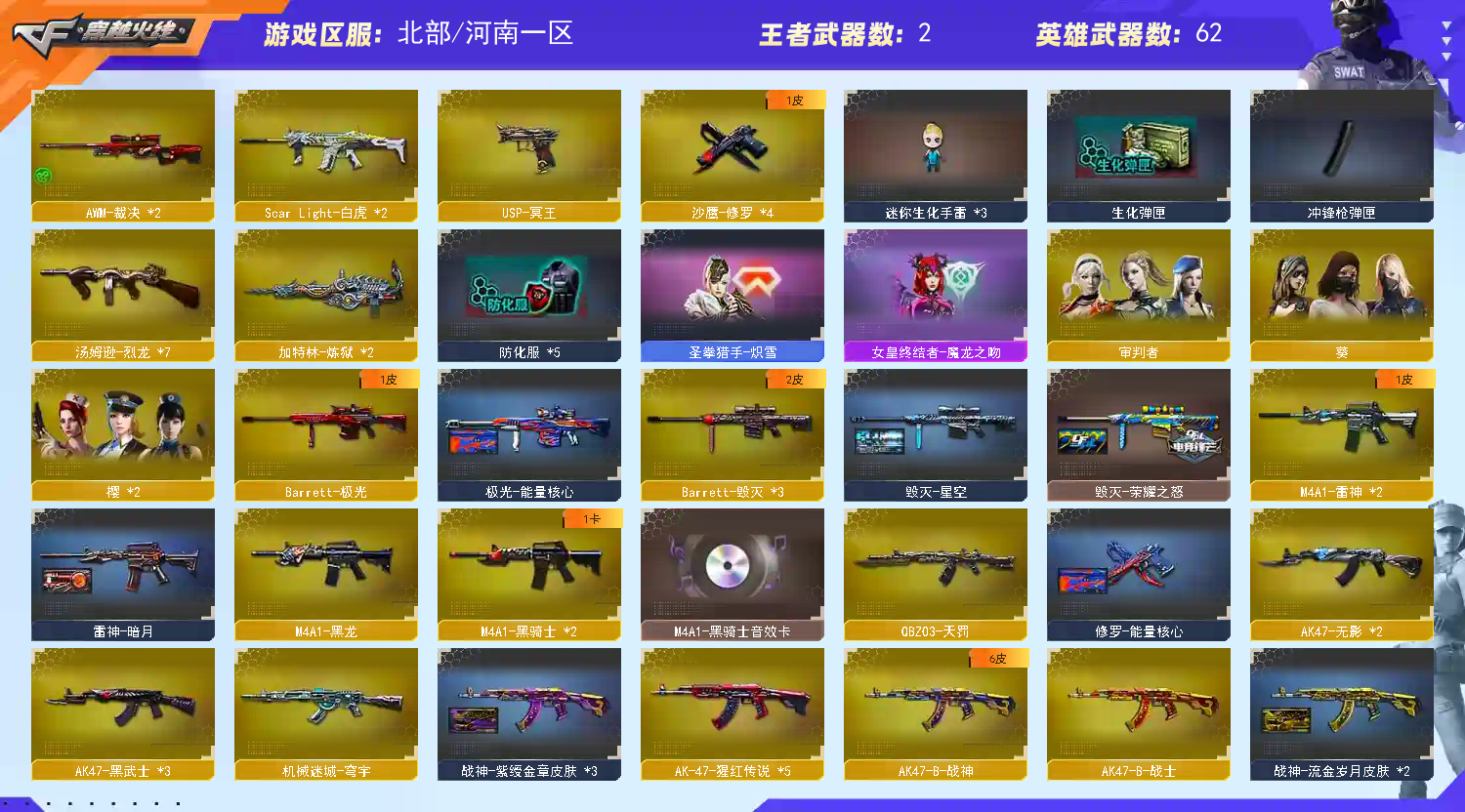 首页 > 租号大厅 > 穿越火线 > 北部/河南一区 > 生化号,6烈龙,48英雄武器,可排位