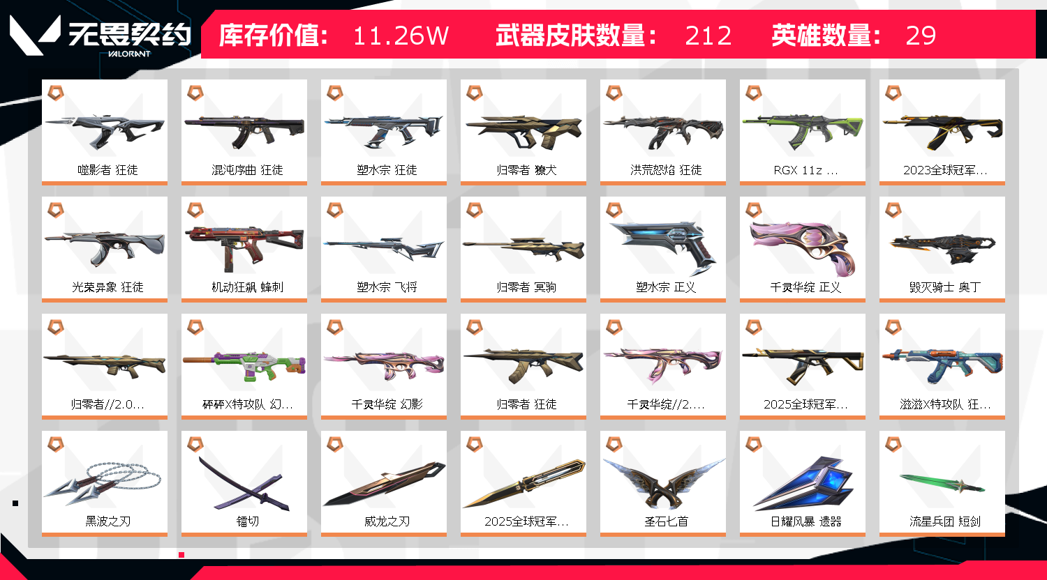 首页 > 租号大厅 > 无畏契约-wegame > wegame/wegame > 可排位✨上三带妹装13号✨塑水套✨归零套✨盖亚套✨25冠军套✨ 23冠军狂徒✨VCT篆刀