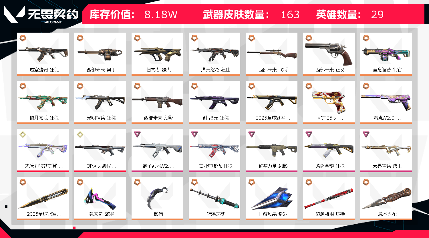 郑重声明: !!!!!因无畏契约检测严格,为防止后台插件导致封号,请务必重启电脑!!!!本人商户多年,所属账号已在派出所备案,若出现账号封禁/毁号等情况,会马上与平台联系,平台会报警处理!请租客文明游戏,不要开挂或挂机! 1.请勿使用第三方软件/插件/外挂◇平台检测到会直接完单。2.登陆界面稍等2分钟会上去(自动登录)老板不要着急,一次不行多来几次wegame界面要耐心等2分钟 3..密令会自动输入如果一次不成功多来几次 4.请及时续租不要挂机,到时不下线,但是下一个会挤号导致挂机,所以请及时续租,导致禁赛的一律拉黑 5.祝老板玩的愉快,喜欢可以收藏关注!开挂必追究,不拿到赔偿不罢休! 如果上号正在游戏中,是上个租客到时不下线导致的,不是顶号,请帮忙打完这局,谢谢了。 时间到了建议续租,打完撤单,为了防止顶号,请您及时续租获得更好的游戏体验;西部未来 奥丁,归零者 獠犬,盖亚的复仇 狂徒,虚空遗器 狂徒,洪荒怒焰 狂徒,侦察力量 幻影,紫阙金琅 狂徒,