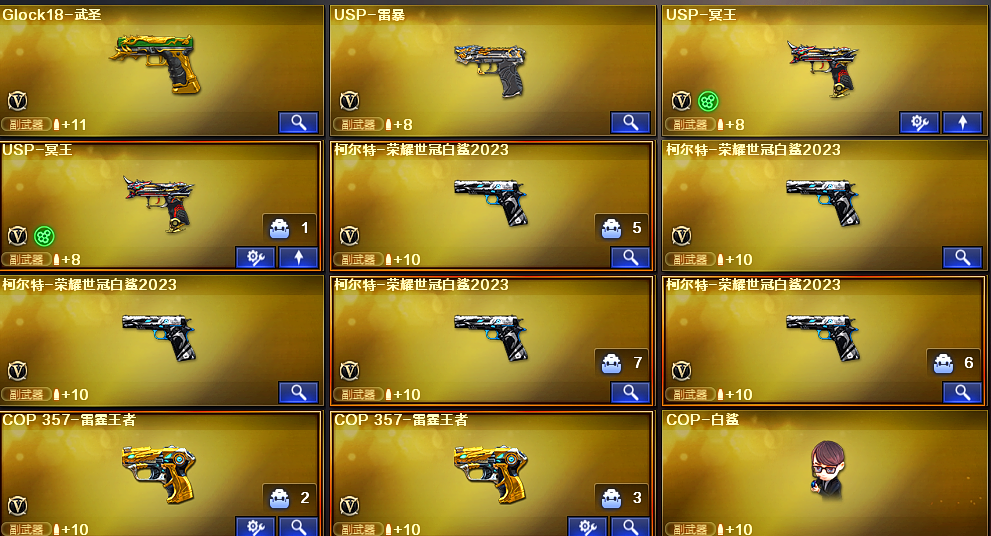 艾莉莎幽瞳幻神新白鲨星耀4皮音G36C裁决套星神套天戎qbz套usp3柯尔特5cop2蝶刃*7玄豹套;USP-雷暴,柯尔特-荣耀世冠白鲨2023,炽芒蝶刃,隼,传说艾莉莎,QBZ03-金色蔷薇,传说幽瞳,