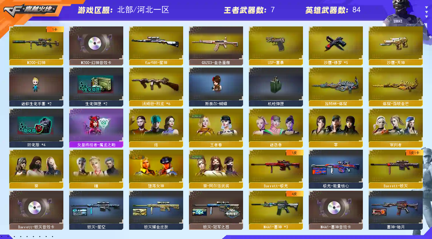 【M200-幻神+音效卡】【Kar98K-星神】【QBZ03-金色蔷薇】【生化 炼狱 6烈龙 蝴蝶】【毁灭+音效卡+毁灭-冠军之怒】【极光】【火麒麟+音效卡+火麒麟-even】【黑龙】【雷神+音效卡】【黑骑士+音效卡】【王者之心 王者之决】【千变 死神 黑武士 超新星】【9手枪 修罗*5 天神 usp雷暴】【18近战 屠龙*4 龙啸*5 擎天 麒麟刺 斩神刀雷暴 王者之锋 王者之击】【手雷 雷霆雷 雷暴雷*4】【四防 王者春】;USP-雷暴,QBZ03-金色蔷薇,M200-幻神,Kar98K-星神,