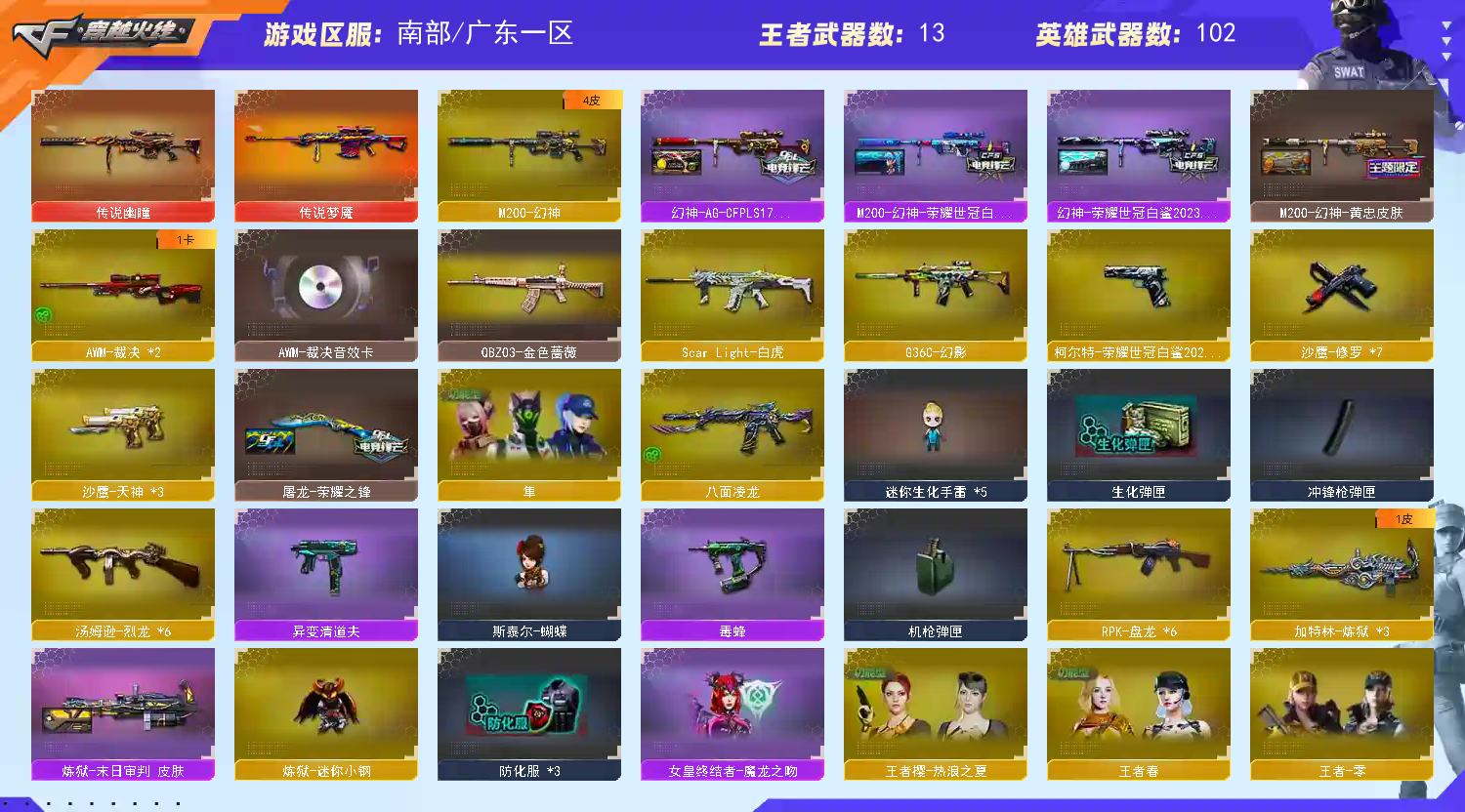 111111;柯尔特-荣耀世冠白鲨2023,隼,RPK-盘龙,QBZ03-金色蔷薇,传说幽瞳,G36C-幻影,M200-幻神,