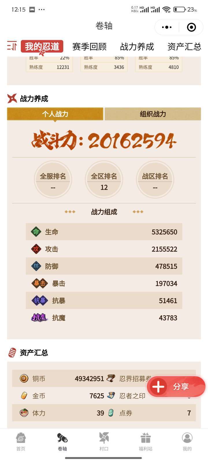 • 火影段位: 上忍3阶