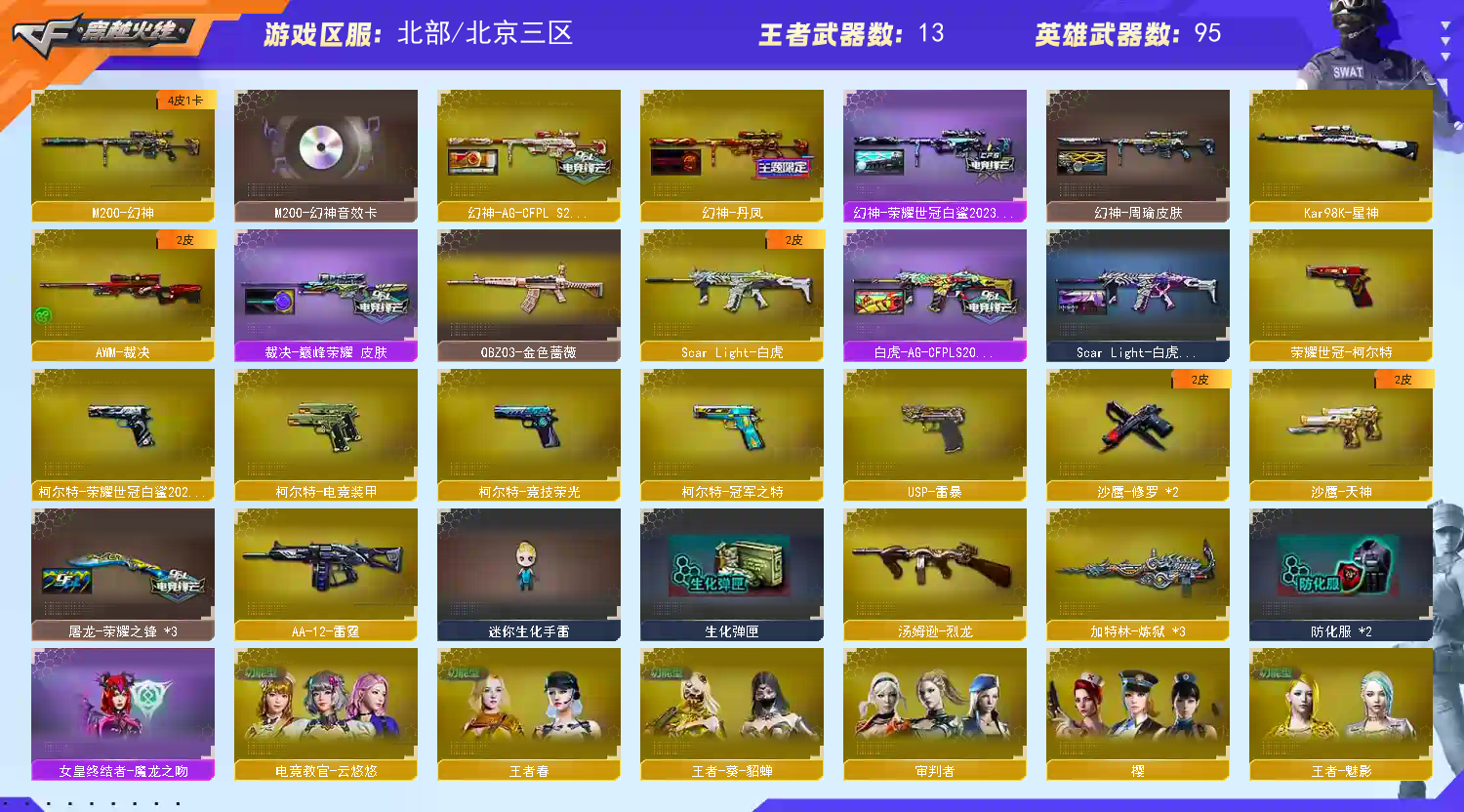 禁止利用账号进行开挂、使用辅助违规软件诈骗等违规操作。;USP-雷暴,荣耀世冠-柯尔特,柯尔特-荣耀世冠白鲨2023,柯尔特-冠军之特,电竞教官-云悠悠,QBZ03-金色蔷薇,M200-幻神,