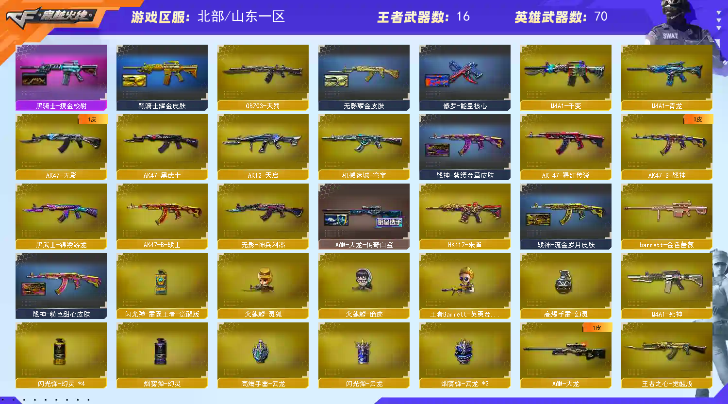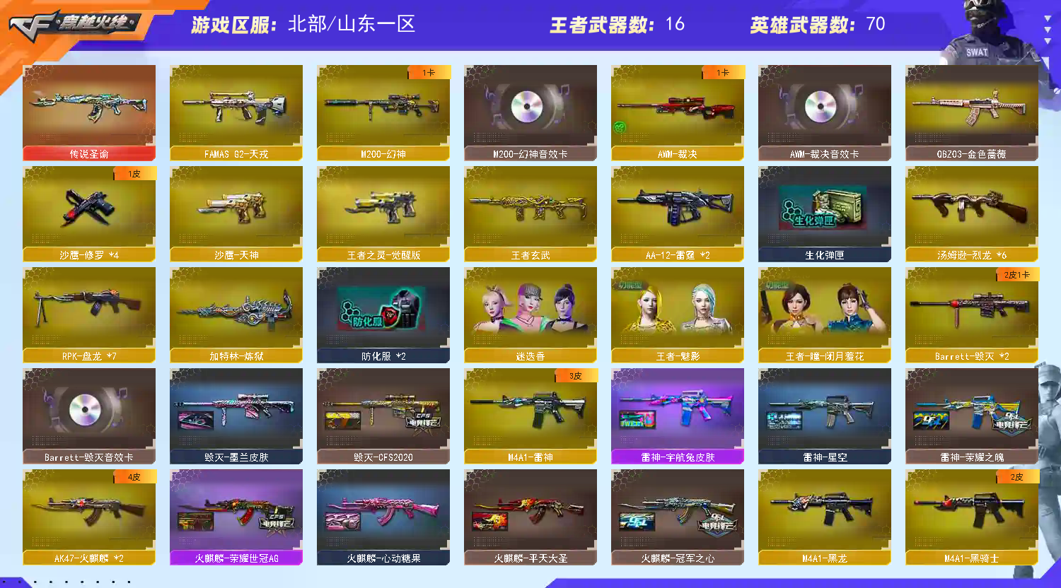 M200-幻神+幻神音效卡】【6盘龙 炼狱 6烈龙 死亡之眼】【传说圣谕】【qbz金色蔷薇】【朱雀 天戎】【火麒麟+冠军之心+荣耀世冠】【黑龙】【雷神+荣耀之魄】【黑骑士】【毁灭+卡+cfs2018】【裁决+裁决音效卡】【武器:青龙 朱雀 天罚 王者之心 王者之魄 王者之势 】【6手枪:修罗*4 天神 王者之灵 】【9刀具:屠龙*2 龙啸 擎天 麒麟刺 幻灵之峰 云龙扇 王者之啸 雷霆王者之锋】【雷套:幻灵雷 云龙雷】【小人枪:火麒麟绝迹 火麒麟灵狐 天龙乔伊教练】【音效卡:幻神音效卡 裁决音效卡 毁灭音效卡 】【四防角色:王者魅影;RPK-盘龙,QBZ03-金色蔷薇,M200-幻神,传说圣谕,