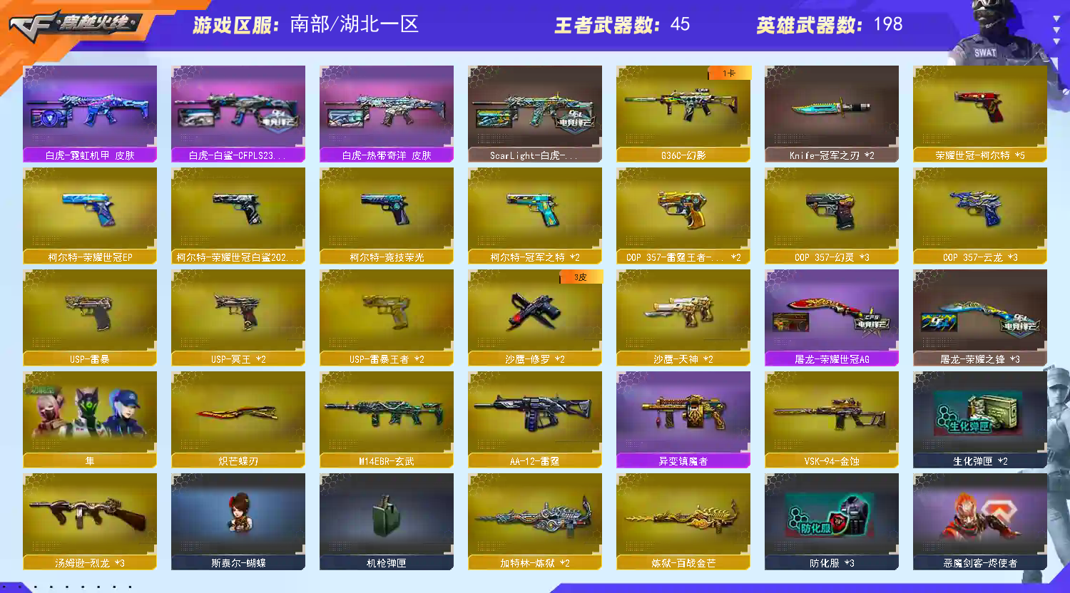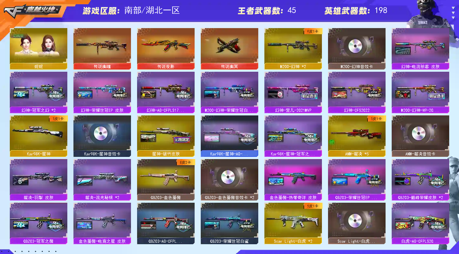 【亮点解析 幻神三件套+9皮 Kar98K-星神三件套 QBZ03-金色蔷薇三件套 ScarLight-白虎三件套 Knife-冠军之刃】【传说幽瞳+传说幽冥】【M200-幻神+音效卡+幻神电流骇客+荣耀世冠ep+幻神-cfs2022+幻神-N9+幻神-AG-CFPLS17+幻神-荣耀世冠白鲨+幻神-宠儿+幻神-冠军之幻】【竞技荣光套+四防云悠悠+usp雷暴王者】【Kar98K-星神+音效卡+破竹+Kar98K星神冠军之星+ag21冠军】【王者风神】【王者星神】【王者星霆】【传说夜影】【g36c幻影】【王者白虎】【ScarLight-白虎+音效卡+白鲨23冠军+冠军之虎】【QBZ03-金色蔷薇+音效卡+荣耀世冠ep+巅峰荣耀+荣耀世冠白鲨】【生化 2炼狱 3烈龙 蝴蝶】【裁决+流光秘银】【毁灭+音效卡+毁灭-荣耀之怒】【极光】【荣耀世冠-火麒麟】【荣耀世冠-雷神】【云龙套】【幻灵套】【火麒麟+火麒麟-横秒之巅+火麒麟-冠军之心】【麒麟】【黑龙+音效卡】【雷神+音效卡+航星+巅峰荣耀+雷神-lgd18冠军+雷神-宠儿+雷神-传奇n9+雷神-荣耀之魄+雷神-白鲨14冠军】【黑骑士+音效卡+白马银枪-黑骑士-冠军之势】【王者之武 王者冰魄 王者火魄 王者芳薇】【天启 机械迷城 黑鲨 hk417-朱雀】【29手枪 修罗*2 天神*2 usp雷暴 cop幻灵*3 usp冥王*2 cop云龙*3 柯尔特荣耀世冠白鲨2023 cop雷霆王者*2 冠军之特*2 usp雷暴王者*2 柯尔特荣耀世冠ep】【28近战 屠龙*6 擎天 麒麟刺 斩神刀雷暴 幻灵之锋*3 炽芒蝶刃蝴蝶刀 云龙扇*2 王者之锋*2 王者之啸 王者之击 王者之刺 王者玉锋】【手雷 雷暴雷*4 幻灵雷*7 竞技荣光*4 云龙雷*3 雷霆王者 】【四防 晴雅 鹰 影豹 隼 王者葵貂蝉 王者魅影 我的发 王者凌霄 王者潘多拉 王者涂鸦】;USP-雷暴,USP-雷暴王者,荣耀世冠-柯尔特,柯尔特-荣耀世冠白鲨2023,传说幽冥,柯尔特-冠军之特,炽芒蝶刃,