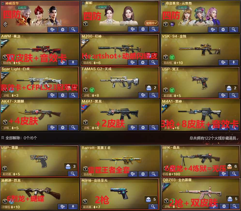 生化爆破号✅四防神威莲华+四防妮妮+6烈龙蝴蝶6盘龙炼狱✅幻神女团皮✅法玛斯+裁决4件套+白虎3件套+QBZ双皮肤+金蚀 稀有武器:M200幻神、FAMS G2-天戎、烈龙X6+斯泰尔蝴蝶、盘龙X6+4炼狱、炼狱百战金芒、VSK金蚀、SL白虎X2、QBZ金色蔷薇、火麒麟、黑龙、雷神X3、黑骑士X3、黑武士、天启、超新星、机械迷城、无影神兵利器、死神雪域霜狐、机械迷城穹宇、朱雀电竞之星、天罚斗烈龙驹、玫瑰精灵、天龙、毁灭X3、极光、裁决、修罗X3、天神X2、USP雷暴、柯尔特竞技荣光X2、USP冥王、COP云龙、柯尔特电竞之星、屠龙X5、龙啸、擎天X4、麒麟刺、尼泊尔雷霆、擎天竞技荣光、丛林匕首玄豹、麒麟刺百战金芒、屠龙电竞之星、屠龙斗烈龙驹、赤狱骑士、苍鸣雷神、竞魂无影、竞魂超新星、碧霄极光、火麒麟瀚海蓝晶 稀有角色:神威莲华(四防:生存本能+捕食者之眼+生化觉醒狂暴化+佣兵觉醒无需换弹)、电竞教官云悠悠(四防:生化背包变更+捕食者之眼+生化觉醒狂暴化+佣兵觉醒无需换弹)、妮妮(四防:生化背包变更+捕食者之眼+生化觉醒狂暴化+佣兵觉醒无需换弹)、雨墨(四防)、葵、零、星际战将、玄豹(四防)、樱、不败狙神、零纪元、斗烈龙驹、幻面灵狐、葵阿尔法武装、雪域霜狐、暗夜X、毒蝎X、救世主X、零水下丽影 音效卡:白虎音效卡、裁决音效卡、雷神音效卡、死神雪域霜狐音效卡、麒麟刺百战金芒庆典舞曲音效卡、炼狱百战金芒庆典舞曲音效卡、碧霄极光音效卡、苍鸣雷神音效卡、屠龙电竞之星竞星悦动音效卡、朱雀电竞之星朱雀竞星悦动音效卡、屠龙斗烈龙驹斗烈音效卡、天罚斗烈龙驹斗烈音效卡 稀有皮肤:幻神Heartshot皮肤/动感闪耀皮肤、QBZ金色蔷薇破浪逐光皮肤/量子蔷薇皮肤、白虎CFPLS23冠军皮肤、裁决典雅胡桃皮肤/叶芒苍灵皮肤、毁灭枪娘格雷姐妹皮肤/CFS2018皮肤/英雄计划皮肤/巅峰荣耀皮肤/耀金皮肤/暗月皮肤、雷神紫凛皮肤/荣耀之魄皮肤/神秘按键皮肤/诺拉皮肤/白鲨CFPLS14冠军皮肤/化蛇皮肤/源计划2.0专属皮肤/能量核心皮肤、擎天梧桐皮肤/HUya频台皮肤、龙啸幻灵之哮皮肤/紫凛皮肤、屠龙破浪逐光皮肤/荣耀之峰皮肤、天神暗月皮肤、天龙秘银皮肤/CFstar皮肤、黑骑士暗月皮肤/破界皮肤/冠军之势皮肤、黑龙暗月皮肤/能量核心皮肤、火麒麟传奇石头横秒之巅皮肤/CFstar皮肤/轻羽皮肤/AG战队皮肤、炼狱星空皮肤 王者炫金武器:王者猎神、王者之怒、BArrett雷霆王者、王者森力、USP雷暴王者、王者之啸、雷霆王者之锋、炫金黑龙、炫金毁灭X2、炫金修罗 投掷套装:雷霆套、竞技荣光套X2、玄豹套、雷暴王者套、闪光弹神/烟雾弹工天巧、闪光弹云龙、闪光弹/烟雾弹雷霆王者 小人枪武器特殊武器:火麒麟零纪元、水枪不败狙神、集束激光超越MAX、机甲撕裂者、激光毁灭者X4、双面神竞魂、青曜、神圣爆裂者蓝风铃、异变镇魔者、征服者超越、USP竞魂、阐释者、SL马枪、黑桃战神、斯泰尔蝴蝶、M37葵、COP旗袍、迷你生化手雷;USP-雷暴,USP-雷暴王者,电竞教官-云悠悠,妮妮,RPK-盘龙,QBZ03-金色蔷薇,M200-幻神,