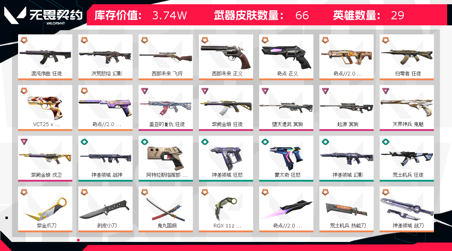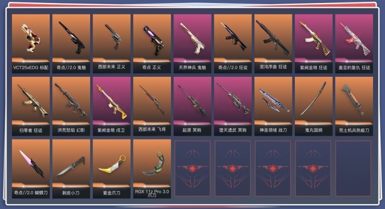 狙击枪皮肤(3) 冥驹-起源,冥驹-堕天遗武,飞将-西部未来;紫金爪刀,剥皮小刀,盖亚的复仇 狂徒,洪荒怒焰 幻影,紫阙金琅 狂徒,混沌序曲 狂徒,堕天遗武 冥驹,