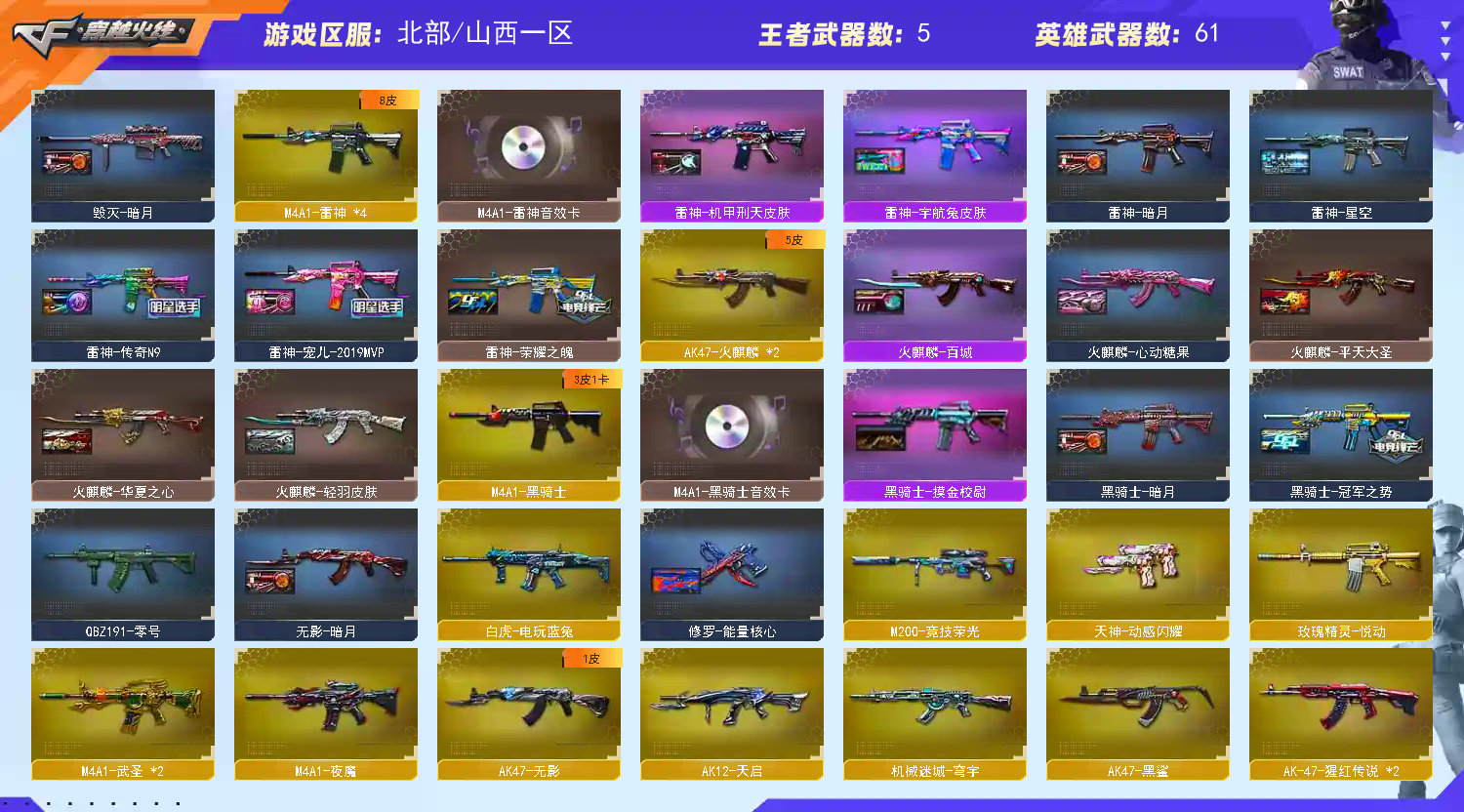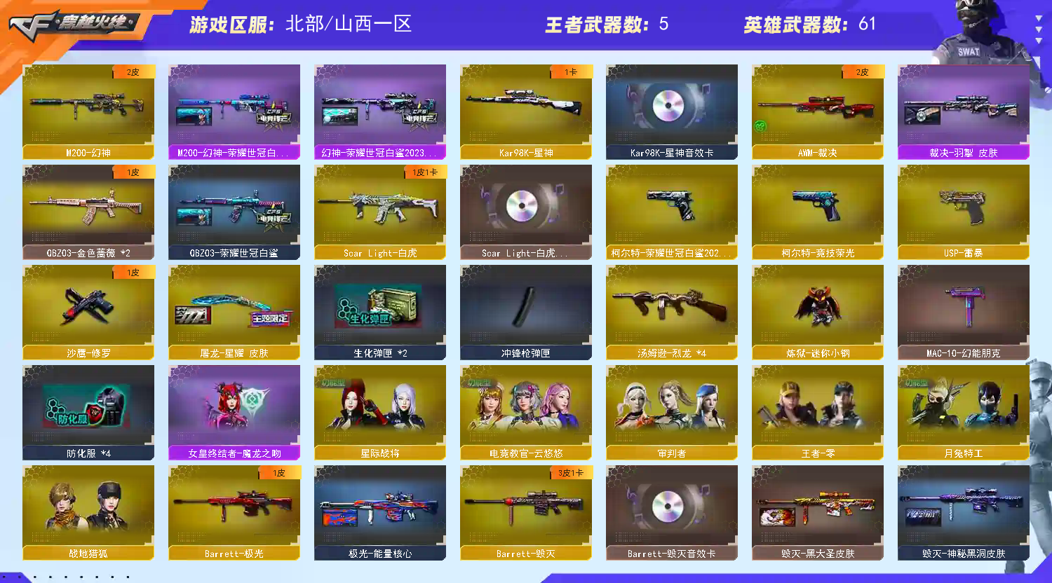 M200-幻神+幻神-荣耀世冠白鲨+幻神-荣耀世冠白鲨2023】【竞技荣光套+四防云悠悠+usp雷暴】【Kar98K-星神+音效卡】【ScarLight-白虎+音效卡】【QBZ03-金色蔷薇】【裁决+羽掣】【Barrett-毁灭+音效卡】【极光】【堕天神套】【AK47-火麒麟】【M4A1-雷神+音效卡+雷神-传奇n9+雷神-宠儿+雷神-荣耀之魄+雷神-白鲨14冠军】【黑骑士+音效卡+黑骑士-冠军之势】【王者之翼 王者之武 王者冰魄 王者炎心】【无影 天启 黑鲨 】【6手枪 修罗 usp雷暴 竞技荣光 柯尔特荣耀世冠白鲨2023】【近战 屠龙*3 竞技荣光】【手雷 夜魔雷 竞技荣光 】【角色 王者零 修道士 云海玲珑】【Kar98K-星神音效卡 Barrett-毁灭音效卡 黑骑士音效卡 Barrett-毁灭音效卡;USP-雷暴,柯尔特-荣耀世冠白鲨2023,电竞教官-云悠悠,QBZ03-金色蔷薇,M200-幻神,Scar Light-白虎,Kar98K-星神,