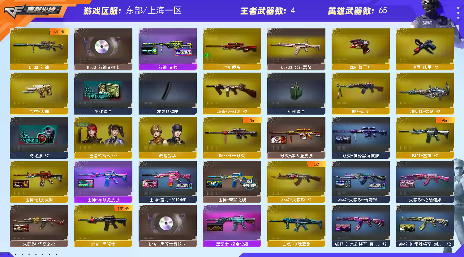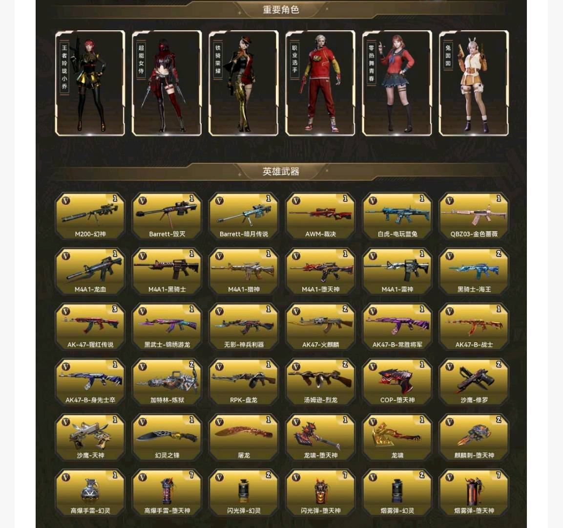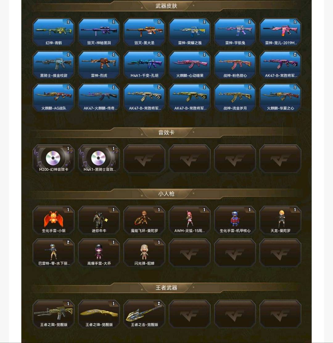 【稀有套装1】:堕天神套装;【重要角色6】:王者玲珑-小乔/超能女侍/铁骑荣耀/职业选手/零-热舞青春/兔囡囡;【武器皮肤20】:幻神-青鹤/毁灭-神秘黑洞/毁灭-黑大圣/雷神-荣耀之魄/雷神-宇航兔/雷神-宠儿-2019MVP/黑骑士-摸金校尉/雷神-烈虎/M4A1-千变-孔明/火麒麟-心动糖果/战神-粉色甜心/AK47-B-常胜将军-曹操*2/火麒麟-AG战队/AK47-火麒麟-传奇EVEN/AK47-B-常胜将军-刘备*2/AK47-B-常胜将军-孙权/战神-流金岁月/火麒麟-华夏之心;【英雄武器64】:M200-幻神/Barrett-毁灭/Barrett-暗月传说/AWM-裁决/白虎-电玩蓝兔/QBZ03-金色蔷薇/M4A1-龙血/M4A1-黑骑士/M4A1-猎神/M4A1-堕天神/M4A1-雷神/黑骑士-海王*2/AK-47-猩红传说*3/黑武士-锦绣游龙/无影-神兵利器/AK47-火麒麟*2/AK47-B-常胜将军/AK47-B-战士/AK47-B-身先士卒/加特林-炼狱*2/RPK-盘龙/汤姆逊-烈龙*2/COP-堕天神/沙鹰-修罗*2/沙鹰-天神/幻灵之锋/屠龙/龙啸-堕天神/龙啸/麒麟刺-堕天神*2/高爆手雷-幻灵/高爆手雷-堕天神*7/闪光弹-幻灵*2/闪光弹-堕天神*7/烟雾弹-幻灵*2/烟雾弹-堕天神*7;【热门武器8】:2炼狱/1黑骑士/2修罗/2烈龙/1盘龙;【音效卡2】:M200-幻神音效卡/M4A1-黑骑士音效卡;【王者武器4】:王者之戮-觉醒版/王者之锋-觉醒版/王者之击-觉醒版*2;【小人枪10】:生化手雷-小钢/迷你牛牛/魔能飞环-曼陀罗/AWM-灵狐-15周年嘉年华/生化手雷-机甲核心/天龙-曼陀罗/巴雷特-零-水下丽影*2/高爆手雷-大乔/闪光弹-貂蝉;;RPK-盘龙,QBZ03-金色蔷薇,M200-幻神,