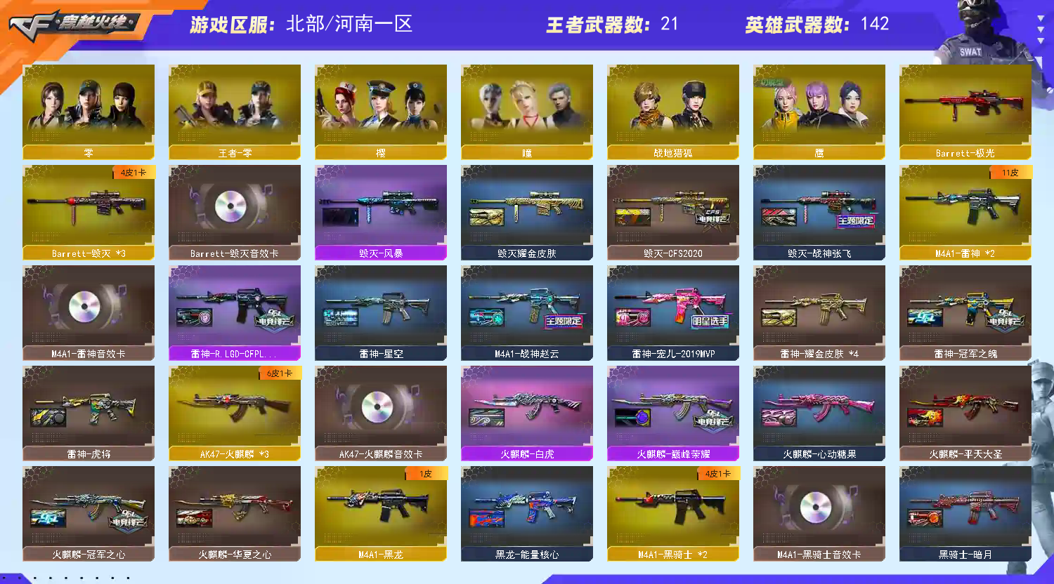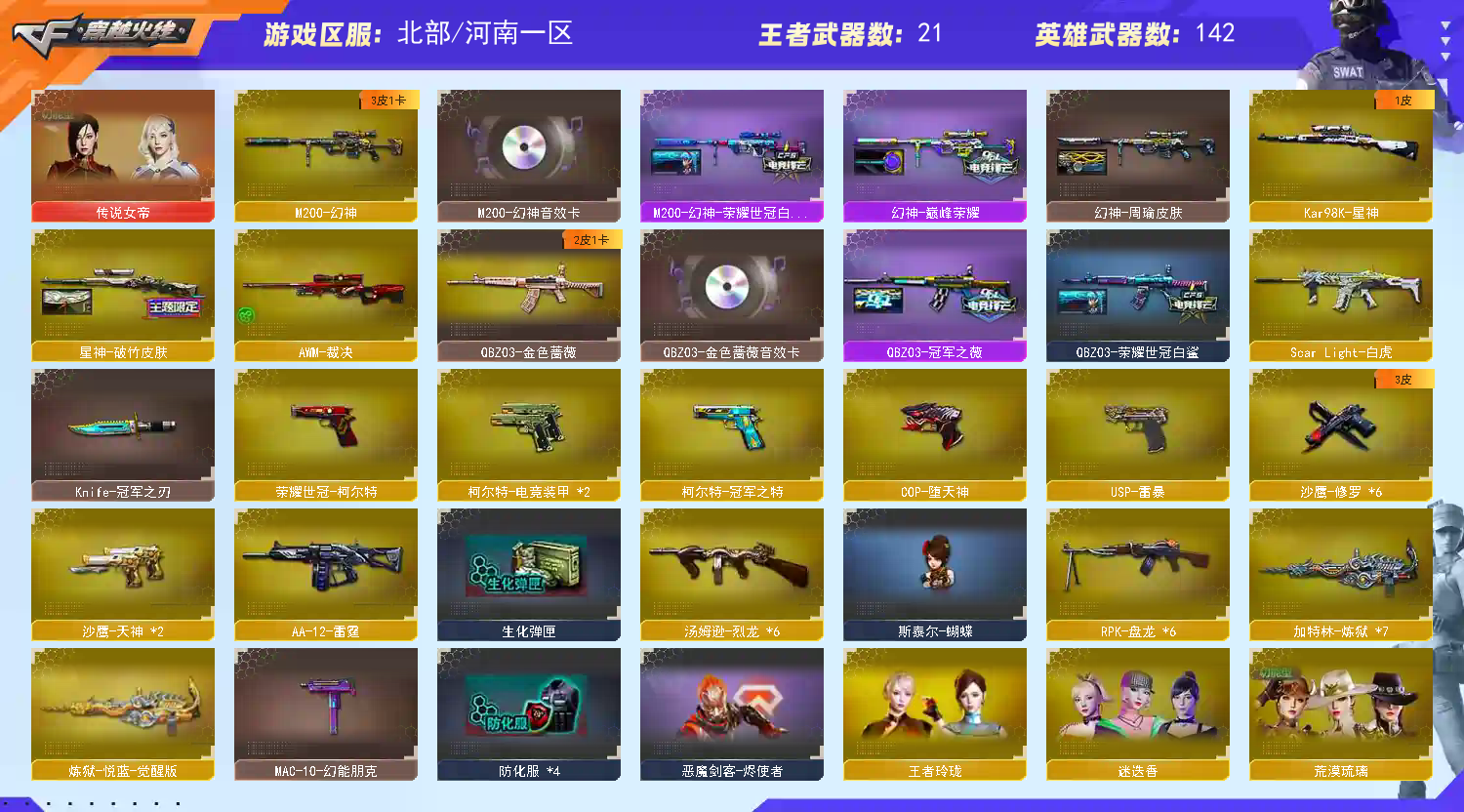 幻神三件套 Knife-冠军之刃 生化六盘六烈六炼狱+蝴蝶】【四防传说女帝】【M200-幻神+音效卡+幻神-巅峰荣耀+幻神-荣耀世冠白鲨+幻神-周瑜】【Kar98K-星神+破竹】【王者幻神】【王者白虎】【ScarLight-白虎】【QBZ03-金色蔷薇+音效卡+冠军之薇】【生化 6盘龙 6炼狱 6烈龙 蝴蝶 死亡之眼 黄金猫猫手套白鲨】【裁决】【Barrett-毁灭+音效卡】【极光】【雷暴套】【堕天神套】【AK47-火麒麟+音效卡+巅峰荣耀+火麒麟-冠军之心】【黑龙】【M4A1-雷神+音效卡+雷神-lgd18冠军+雷神-宠儿+雷神-白鲨14冠军+;是根据】【黑骑士+音效卡+黑骑士-冠军之势】【王者之心 王者之戮 王者之幻 王者火魄 王者青龙 王者之力 王者之决 】【死神 黑武士 天启 超新星 黑鲨 龙血 hk417-朱雀 玫瑰精灵 烈火】【16手枪 修罗*6 天神*2 usp雷暴 cop堕天神 王者之魂 荣耀世冠-柯尔特 柯尔特-冠军之特 】【21近战 屠龙*3 龙啸*6 擎天*2 麒麟刺*2 斩神刀雷暴 王者之啸】【手雷 雷暴雷 堕天神 电竞装甲】【四防 鹰;USP-雷暴,荣耀世冠-柯尔特,柯尔特-冠军之特,Knife-冠军之刃,传说女帝,RPK-盘龙,QBZ03-金色蔷薇,