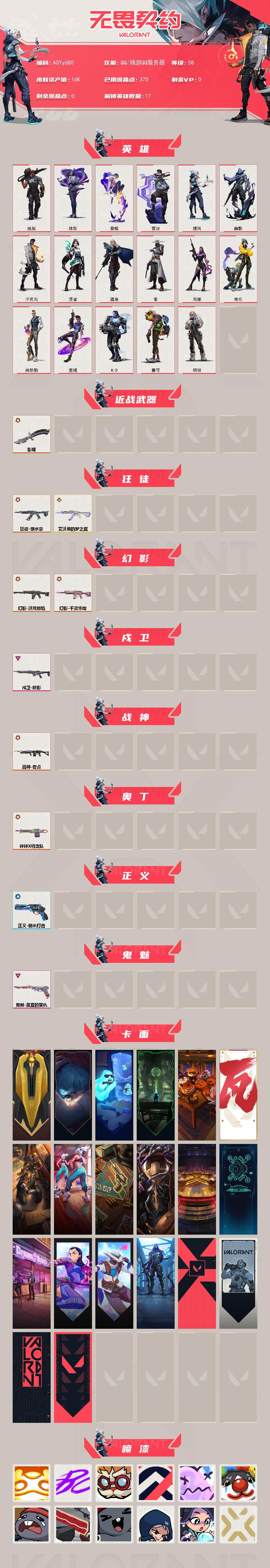 冻结三分钟内解除,短信通知重新上即可!喜欢收藏不迷路、游戏异常进小黑屋、时间不够请提前续租或者不要开局 【掠夺蝴蝶刀.双狂徒双幻影塑水宗.猫猫.流脓幻影.莲花.奇点战神】 【英雄】:炼狱,维斯,暮蝶,壹决,捷风,幽影,不死鸟,贤者,猎枭,零,芮娜,奇乐,尚勃勒,星礈,K/O,盖可,钢锁 【近战武器】:近战武器-影蝶 【狂徒】:狂徒-塑水宗,狂徒-艾沃莉的梦之翼 【幻影】:幻影-洪荒怒焰,幻影-千灵华绽 【戍卫】:戍卫-掠影 【战神】:战神-奇点 【奥丁】:奥丁-砰砰X特攻队 【正义】:正义-纳米打 【鬼魅】:鬼魅-盖亚的复仇 【卡面】:进入射程 卡面,《双城之战》拥抱 卡面,精灵大战 卡面,欢迎来到底城 卡面,南瓜盛典 卡面,VCT CN首冠 卡面,修车达人 卡面,热舞环节 卡面,正义的化身 卡面,时间到 卡面,最高舞台 卡面,声感陷阱设计图 卡面,梦幻奶茶 卡面,无畏契约GO!一卷:芮娜 卡面,无畏契约GO!一卷:零 卡面,暗枪 卡面,代号红色 卡面,新兵报到 卡面,V契约 卡面,无畏契约 卡面 【喷漆】:嗨宝南瓜灯 喷漆,嘭! 喷漆,都算到了 喷漆,控场勿近 喷漆,伤心心 喷漆,小丑猫 喷漆,熊抱 喷漆,蛋糕还是爆能器? 喷漆,超级粉丝 喷漆,捷风差距 喷漆,水晶球 喷漆,2021冠军巡回赛花火 喷漆,拼一枪 喷漆,买装还是存钱 喷漆,关门放狗 喷漆,红鳞 喷漆,松叶 喷漆,静电火花 喷漆 ,胜利属于无畏契约 喷漆,GLHF 喷漆,无畏契约 喷漆 【挂饰】:终章:猫猫木乃伊 挂饰,悠闲鸡块 挂饰,伞绳 挂饰,《双城之战》小蛋糕 挂饰,第九季//第三幕 纪念币 挂饰,无畏契约GO!一卷 芮娜 挂饰,无畏契约GO!一卷 零 挂饰,鱼骨头 挂饰,熔岩灯 挂饰,瞬云履 挂饰,第九季//第二幕 纪念币 挂饰,袖珍捷风 挂饰,迷你浓缩 挂饰,动力机箱 挂饰,第九季//一幕 纪念币 挂饰,天外飞客 挂饰,无畏契约 纪念币 挂饰;砰砰X特攻队 奥丁,奇点 战神,掠影 戍卫,洪荒怒焰 幻影,塑水宗 狂徒,