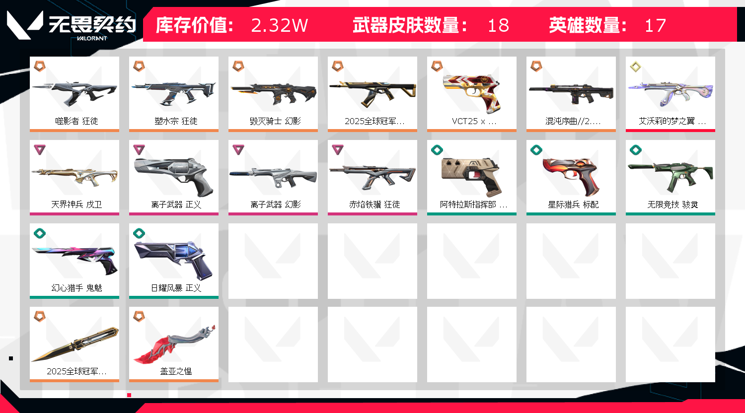 冻结三分钟内解除,短信通知重新上即可!喜欢收藏不迷路、游戏异常进小黑屋、时间不够请提前续租或者不要开局 【套装】:2025全球冠军赛套装 【英雄】:炼狱,暮蝶,壹决,捷风,不死鸟,贤者,猎枭,零,芮娜,尚勃勒,霓虹,K/O,盖可,黑梦 【近战武器】:近战武器-2025全球冠军赛 蝴蝶刀,近战武器-盖亚之愠 【狂徒】:狂徒-2025全球冠军赛,狂徒-塑水宗,狂徒-噬影者,狂徒-艾沃莉的梦之翼,狂徒-赤焰铁骥 【幻影】:幻影-毁灭骑士,幻影-混沌序曲//2.0,幻影-离子武器 【戍卫】:戍卫-天界神兵 【骇灵】:骇灵-无限竞技 【VCT手枪】:标配-VCT25 x EDG 【正义】:正义-离子武器 【卡面】:无畏契约GO!一卷:芮娜 卡面,无畏契约GO!一卷:零 卡面,代号红色 卡面,新兵报到 卡面,V契约 卡面,无畏契约 卡面 【喷漆】:买装还是存钱 喷漆,胜利属于无畏契约 喷漆,GLHF 喷漆,无畏契约 喷漆 【挂饰】:无畏契约GO!一卷 零 挂饰,VCT x EDG 挂饰,天外飞客 挂饰,无畏契约 纪念币 挂饰;噬影者 狂徒,天界神兵 戍卫,塑水宗 狂徒,离子武器 正义,