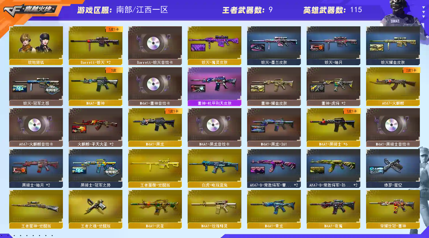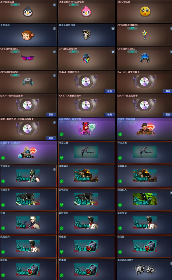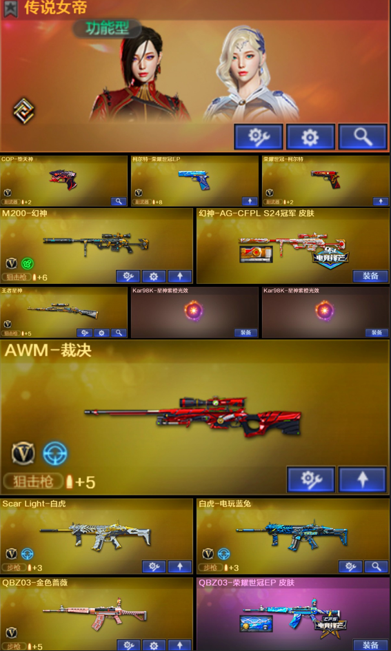 传说女帝❤️幻神AG冠军❤️王者星神❤️炽芒蝶刃❤️QBZ蔷薇世冠EP❤️裁决❤️白虎❤️6烈蝴蝶❤️6盘炼狱❤️6黑骑士❤️ 【稀有武器】:M200-幻神/ScarLight-白虎/M4A1-青龙/M4A1-堕天神/COP-堕天神/荣耀世冠-柯尔特/QBZ03-金色蔷薇/AK47-火麒麟/M4A1-黑龙/M4A1-雷神/M4A1-黑骑士(6)/AK47-无影/荣耀世冠-雷神/白虎-电玩蓝兔/Barrett-毁灭(2)/AWM-裁决/RPK-盘龙(6)/加特林-炼狱(2)/汤姆逊-烈龙(6)/AA-12-雷霆/炽芒蝶刃/麒麟刺-堕天神(3)/龙啸-堕天神/擎天-竞技荣光 【王者武器】:王者之心-觉醒版/王者星神-觉醒版 【热门角色】:传说女帝/乔伊教练/王者-魅影/王者涂鸦/灵狐者-职业经理/潘多拉-X/兔囡囡 【热门音效卡】:M4A1-雷神音效卡/Barrett-毁灭音效卡/M4A1-黑骑士音效卡/AK47-火麒麟音效卡/M4A1-黑龙音效卡 【热门皮肤】:幻神-AG-CFPLS24冠军皮肤/毁灭-冠军之怒 【其他亮点】:斯泰尔-蝴蝶/金刚伞-电玩红兔;荣耀世冠-柯尔特,炽芒蝶刃,传说女帝,妮妮,RPK-盘龙,QBZ03-金色蔷薇,G36C-幻影,