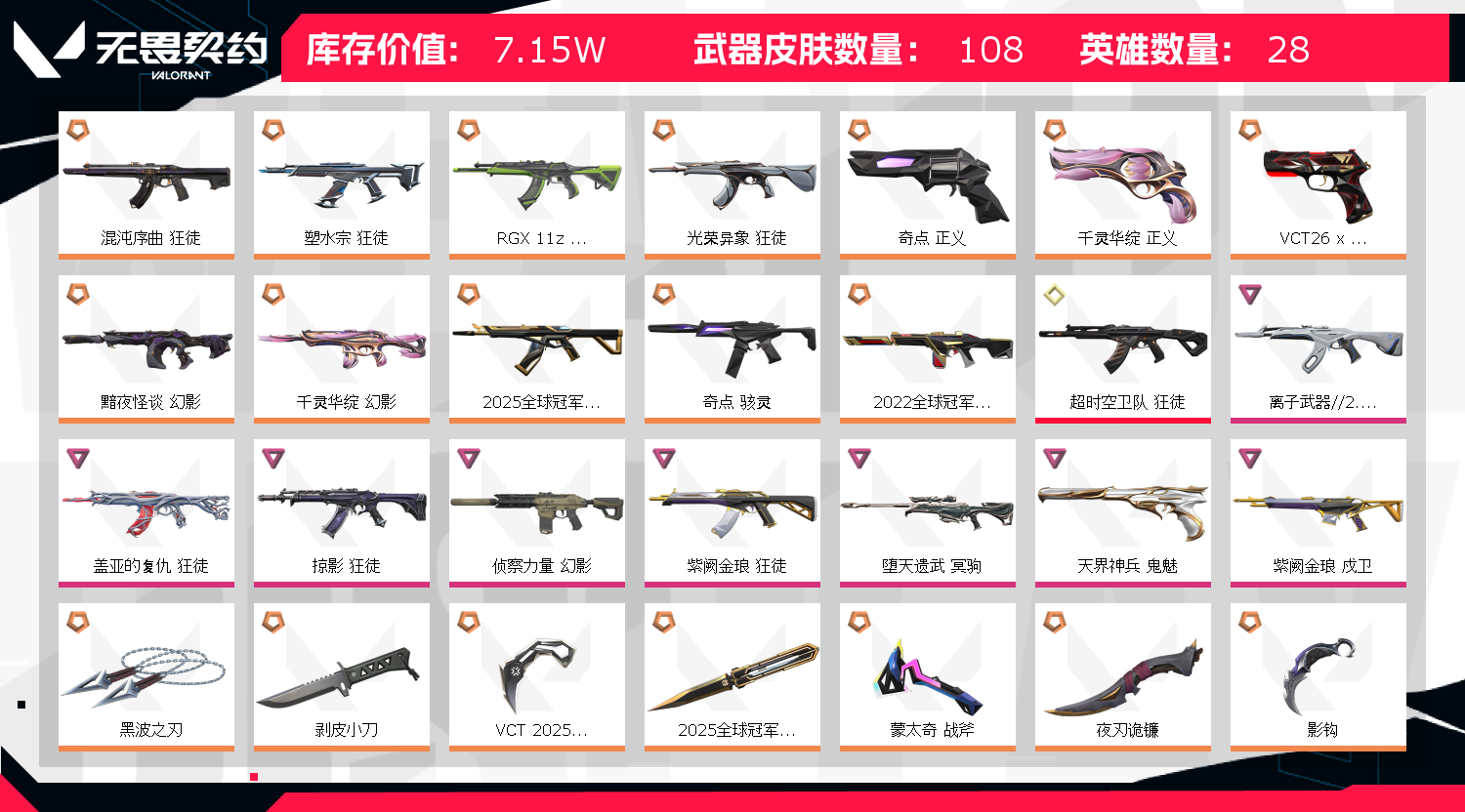 狂徒基本上top前15都有,VCT限定爪刀篆刀,黑波,怜悯,冠军蝴蝶两把 龙爪 剥皮 影钩 混沌,紫金,盖亚,25冠军,光荣,显卡。。。。。。作弊追责!!!!!;黑波之刃,剥皮小刀,VCT 2025 爪刀,盖亚的复仇 狂徒,掠影 狂徒,侦察力量 幻影,紫阙金琅 狂徒,