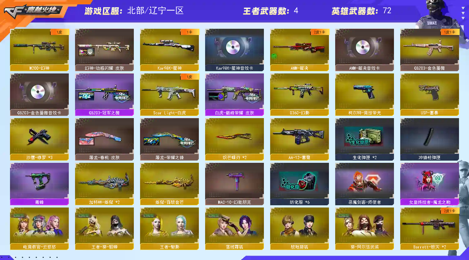 本账号已经过虚拟财产认定,请各位科技大神高抬贵手。请素质租号,文明游戏,谢谢大家配合!!如若使用科技或鼠标宏等特殊外设导致账号出现问题必追究法律责任!<<<封号可查具体违规时间,责任到人>>> 喜欢的老板收藏一下,方便下次找到!;USP-雷暴,炽芒蝶刃,电竞教官-云悠悠,QBZ03-金色蔷薇,G36C-幻影,M200-幻神,Scar Light-白虎,
