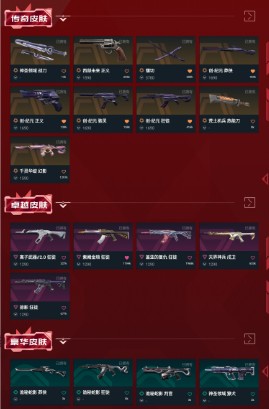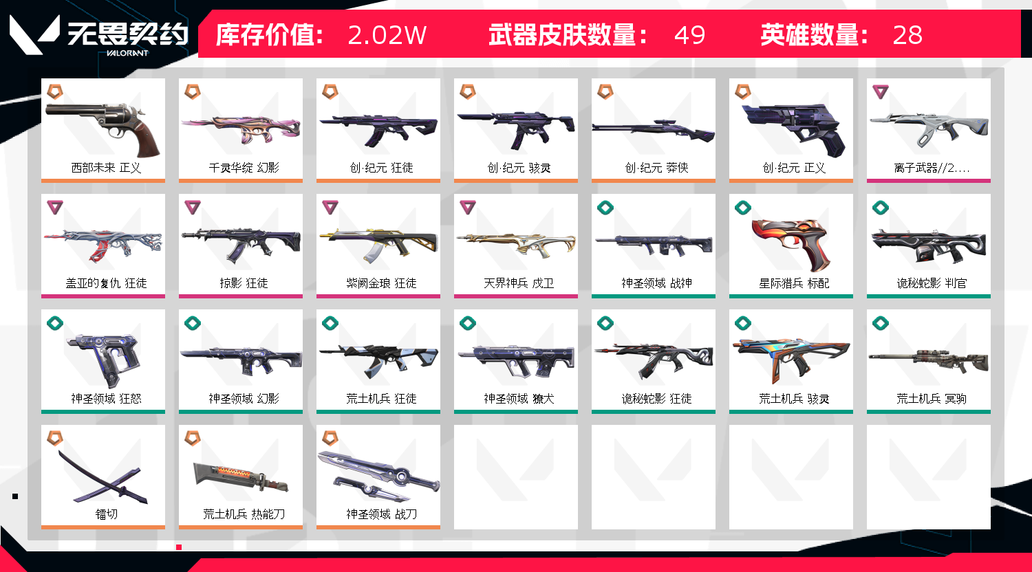 近战武器皮肤(3) 荒土机兵热能刀,镭切,神圣领域 * *皮肤(7) 狂徒-紫阙金琅,狂徒-盖亚的复仇,戍卫-天界神兵,幻影-千灵华绽,狂徒-掠影,狂徒-创·纪元,狂徒-离子武器2.0 佩枪皮肤(2) 正义-创·纪元,正义-西部未来 *皮肤(1) 莽侠-创·纪元 *皮肤(1) 骇灵-创·纪元;镭切,盖亚的复仇 狂徒,掠影 狂徒,紫阙金琅 狂徒,天界神兵 戍卫,离子武器//2.0 狂徒,西部未来 正义,