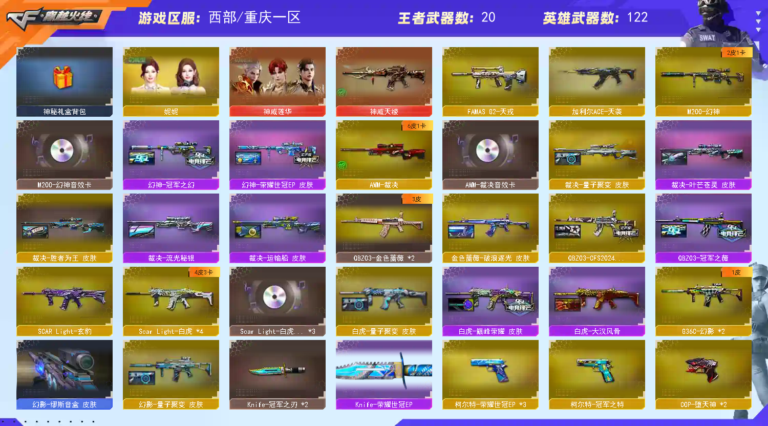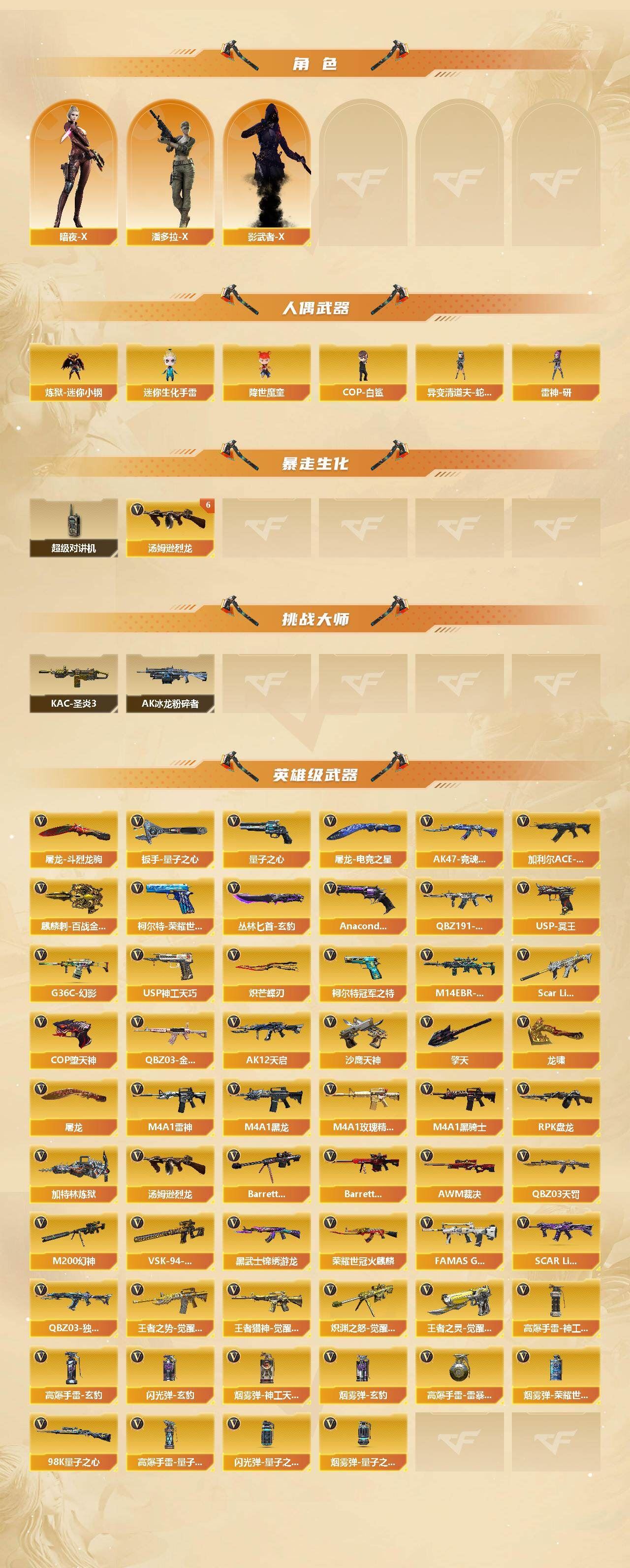 传说武器】:神威天绫【传说角色】:4防神威莲华【热门武器】:G36C-幻影*2,QBZ03-金色蔷薇*2,M14EBR-玄武,Scar Light-白虎*4,M200-幻神,荣耀世冠-火麒麟,柯尔特-冠军之特,炼狱-迷你小钢,M4A1-黑骑士*2,汤姆逊-烈龙*6,RPK-盘龙*3,加特林-炼狱*3,降世魔童,COP-白鲨*2,COP-堕天神*2,Knife-冠军之刃*2,炽芒蝶刃*6,炽芒蝶刃-冠军炽芒皮肤,黄金猫猫手套-白鲨【王者炫金武器】:炽渊之怒,USP-雷暴王者*2,COP-王者堕天神,斩神刀-雷暴王者,龙啸-王者堕天神,麒麟刺-王者堕天神【音效卡】:M200-幻神音效卡,Barrett-毁灭音效卡,AWM-裁决音效卡,Scar Light-白虎音效卡*3,炼狱-百战金芒-庆典舞曲音效卡【皮肤】:幻神-冠军之幻,幻神-荣耀世冠EP 皮肤,白虎-大汉风骨,白虎-巅峰荣耀 皮肤,白虎-量子聚变 皮肤,白虎-拼搏 皮肤,QBZ03-冠军之薇,QBZ03-CFS2024 皮肤,金色蔷薇-破浪逐光 皮肤,裁决-流光秘银,裁决-叶芒苍灵 皮肤,裁决-运输船 皮肤,裁决-胜者为王 皮肤,裁决-星际旅行 皮肤,裁决-量子聚变 皮肤,星神-黯钢战甲 皮肤,雷神-能量核心,雷神-荣耀之魄,M4A1-再燃火线,雷神-宋雨琦 皮肤,毁灭-冠军之怒,毁灭-SV-CFPLS16冠军,HK417-朱雀-量子聚变 皮肤,幻影-量子聚变 皮肤,幻影-缪斯音盒 皮肤,玄武-量子聚变 皮肤,极光-能量核心,炼狱-祈雨狮,修罗-能量核心,屠龙-破浪逐光 皮肤,屠龙-惊鸿 皮肤,轻型军用手斧-再燃火线,炽芒蝶刃-冠军炽芒皮肤,炽芒蝶刃-宋雨琦 皮肤【角色】:4防鹰,隼,机械姬,4防玄豹,荆棘,妮妮,智,零·纪元,乔伊教练,葵-阿尔法武装,幻面灵狐,4防宋雨琦,暗夜-X,北极狐-X,娟娟,兰妹妹,4防灵狐者-职业经理,潘多拉-X,影武者-X,潘多拉-N,团团【人偶武器】:COP-白鲨*2,炼狱-迷你小钢,雷神-研,异变清道夫-蛇影双骄,迷你生化手雷,降世魔童【暴走生化】:超级对讲机【挑战大师】:AK47-冰龙粉碎者,KAC-圣炎切割者III【英雄级武器】:M4A1-黑龙,M4A1-雷神,M4A1-黑骑士*2,AK12-天启,Scar Light-白虎*4,M14EBR-玄武,QBZ03-天罚,G36C-幻影*2,黑武士-锦绣游龙,QBZ191-银翼,FAMAS G2-天戎,SCAR Light-玄豹,QBZ03-独角-III,M4A1-玫瑰精灵,QBZ03-金色蔷薇*2,王者之势-觉醒版,王者猎神-觉醒版,荣耀世冠-火麒麟,加利尔ACE-天袭,Barrett-毁灭,Barrett-极光,AWM-裁决,M200-幻神,VSK-94-金蚀,炽渊之怒-觉醒版,Kar98K-量子之心,RPK-盘龙*3,加特林-炼狱*3,汤姆逊-烈龙*6,沙鹰-天神,COP-堕天神*2,柯尔特-冠军之特,柯尔特-荣耀世冠EP*3,Anaconda-玄豹,USP-神工天巧,Anaconda-量子之心,USP-冥王,王者之灵-觉醒版,屠龙,龙啸,擎天,炽芒蝶刃*6,麒麟刺-百战金芒,丛林匕首-玄豹,扳手-量子之心*2,屠龙-电竞之星,屠龙-斗烈龙驹,高爆手雷-神工天巧,高爆手雷-玄豹*6,高爆手雷-雷暴王者*6,高爆手雷-量子之心*9,闪光弹-玄豹*6,闪光弹-量子之心*9,烟雾弹-神工天巧,烟雾弹-玄豹*7,烟雾弹-荣耀世冠EP,烟雾弹-量子之心*7,AK47-竞魂无影,【道具】:宋雨琦炫彩背包,神秘礼盒背包,BS战队炫彩背包,EP战队炫彩背包,亚洲杯纪念炫彩背包,百战金芒炫彩背包,背包-葫芦兄弟,地狱终结者-妲己,女皇终结者-魔龙之吻,救世主-黑桃战神,绿色巨人,灵魂忍者*2,变异宝贝,迷雾幽灵*2,夺命之镰,防化服*3,流光-鎏金之域,流光-再燃火线,语音特效-盛典烟火,萌萌小葵表情,CFPL选手表情-第2套,EP战队击杀图标,防弹头盔*3,防弹衣*3,C4工具钳*3,手雷包*3【特殊枪械】:4白虎,2黑骑士,6烈龙,3盘龙,3炼狱,;USP-雷暴王者,柯尔特-冠军之特,炽芒蝶刃,Knife-冠军之刃,隼,妮妮,RPK-盘龙,