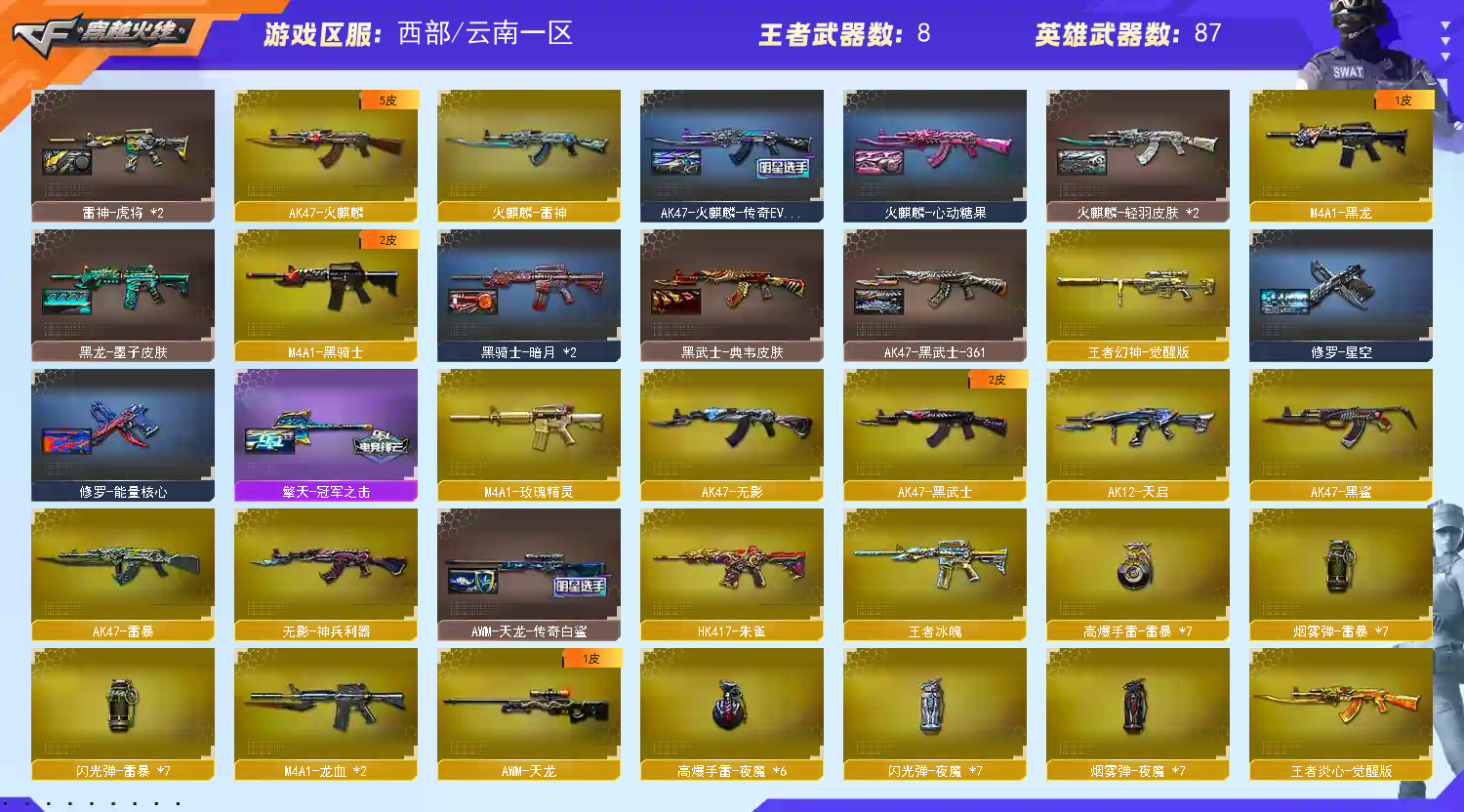 光耀/白虎/幻神/星神/王者幻神/魅影/春/天龙/裁决【毁灭4皮肤3件套】 【步枪】光耀/火麒麟/黑龙/雷神/黑骑士/无影/黑武士/天启/黑鲨/龙血/AK47雷暴/HK朱雀/白虎/无影神兵利器/玫瑰精灵/QBZ金色蔷薇/王者之心/王者之影/王者之武/王者之魄/王者炎心/ 【狙击枪】天龙/毁灭/激光/裁决/幻神/星神/王者幻神/ 【机枪】炼狱x4/ 【冲锋枪】烈龙x2/ 【散弹枪】AA12雷霆/ 【挑战强化武器】黑骑士/黑武士/白虎/玫瑰精灵/裁决/炼狱x4/烈龙x2/ 【生化武器】传说光耀/AK雷暴/朱雀/QBZ金色蔷薇/裁决/幻神/王者之幻/AA12雷霆/ 【手枪】修罗/天神/雷暴/COP堕天神/破空枪刃/ 【刀】屠龙/擎天/麒麟刺/斩神刀雷暴/马来剑夜魔/王者之啸/龙啸龙威/ 【手雷】雷暴手雷套/夜魔手雷套/ 【角色】零/葵/樱/魅影/春/凌霄/ 【卡】雷神卡/极光卡/毁灭卡/ 【皮肤】擎天冠军之击/毁灭耀金/毁灭SV16冠军/火麒麟传奇/毁灭星卡/火麒麟心动糖果/雷神虎将/火麒麟AG战队/天龙传奇白鲨/雷神斗鱼平台/火麒麟轻羽/雷神虎将/黑龙墨子/黑武士典韦/火麒麟青羽/火麒麟雷神/;USP-雷暴,QBZ03-金色蔷薇,M200-幻神,Scar Light-白虎,Kar98K-星神,