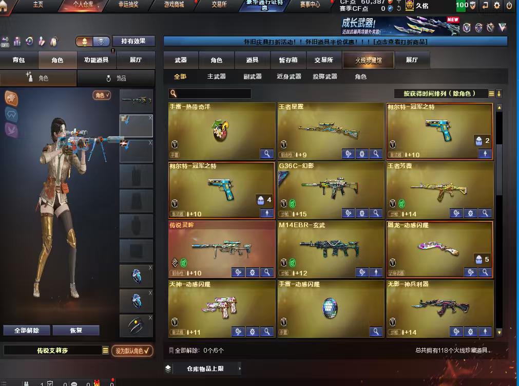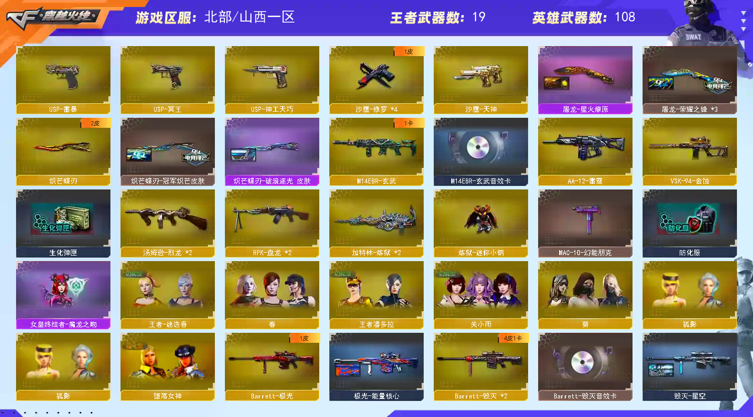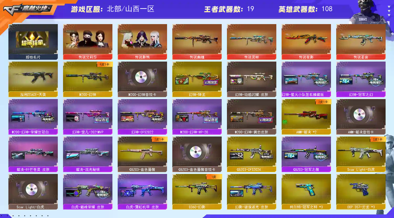 爆破全装艾丽莎,影煞,传说幽瞳,传说灵眸,传说圣谕,传说夜影,幻神8皮加音效卡(星火小队,宠儿念旧,冠军幻,cfs等),雷神11皮加音效卡(十周年至臻典藏,冠军,荣耀,宠儿,念旧,等)白虎音效卡(冠军等2皮),qbz音效卡(冠军,cfs),裁决加音效卡两皮,特殊英雄级,冥王,usp神功,雷暴,冠军特3,云龙cop3,qbz191,玄武加音效卡,天罚加音效卡加皮,轮椅枪,连狙,蝴蝶刀加两皮,近战雷都满。王者星霆,王者白虎等一系列王者武器;USP-雷暴,柯尔特-冠军之特,炽芒蝶刃,传说影煞,传说艾莉莎,RPK-盘龙,QBZ03-金色蔷薇,