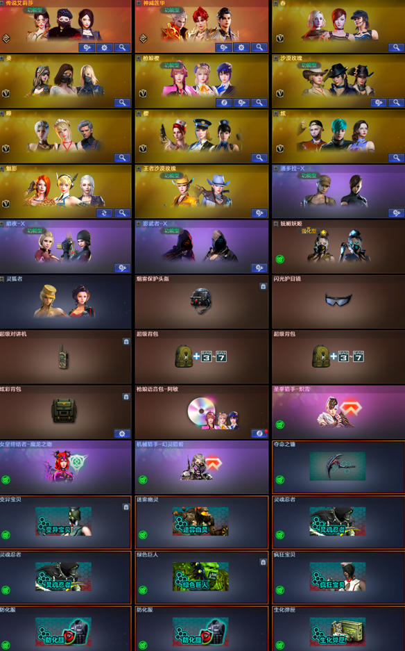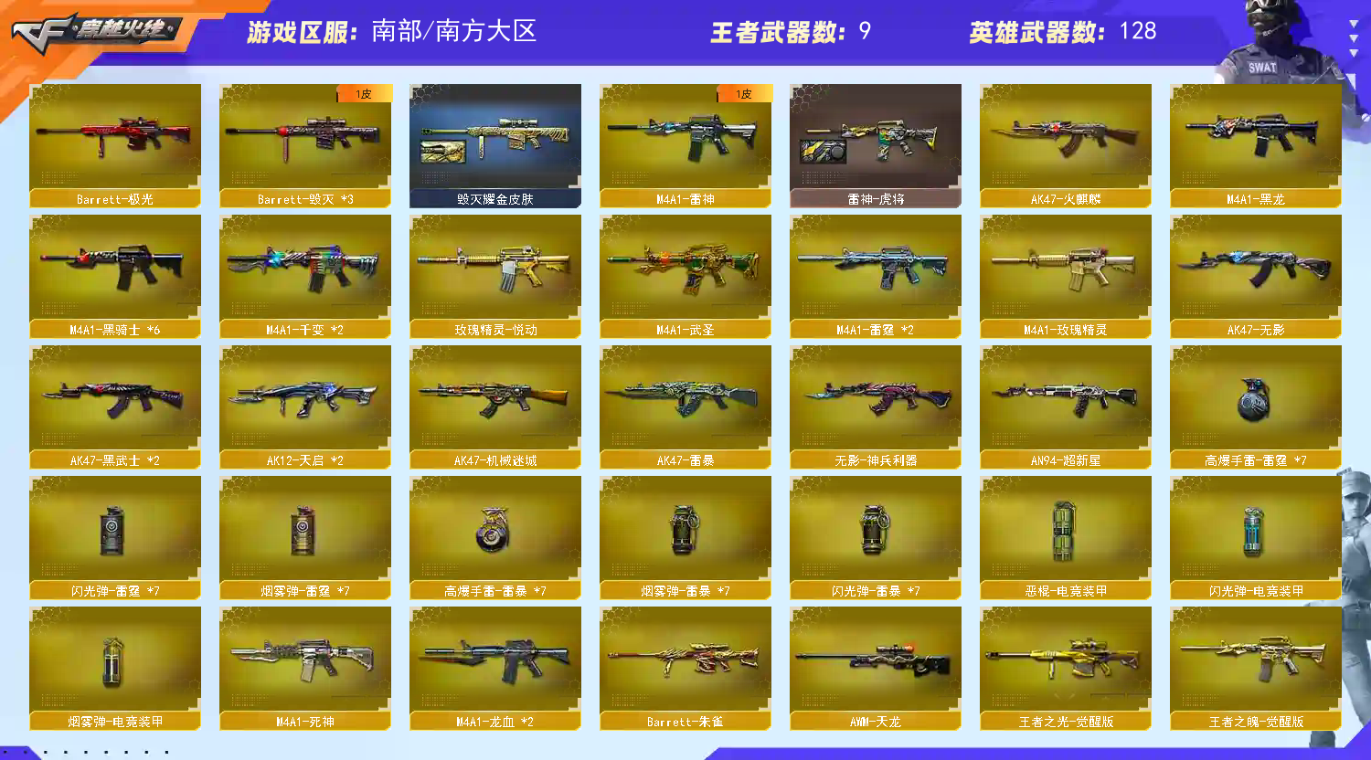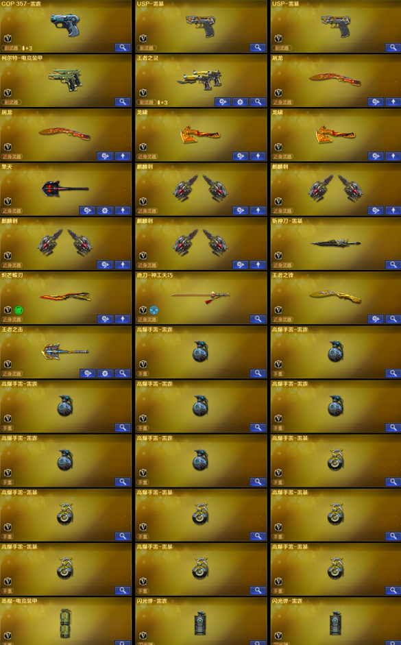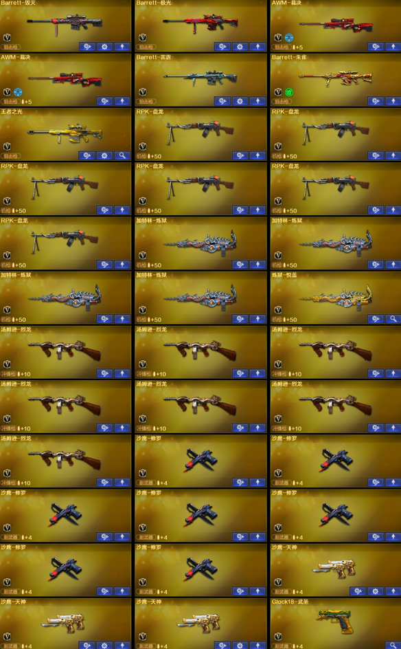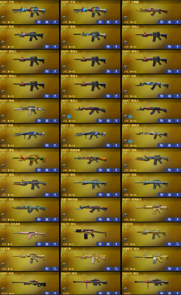 【稀有武器】:M4A1-雷霆(2)/AK47-雷暴/雷霆之契/USP-雷暴(2)/柯尔特-电竞装甲/QBZ03-金色蔷薇/AK47-火麒麟/M4A1-黑龙/M4A1-雷神/M4A1-黑骑士(6)/AK47-无影/AK47-黑武士(2)/Barrett-毁灭(3)/Barrett-极光/AWM-裁决(2)/RPK-盘龙(6)/加特林-炼狱(4)/汤姆逊-烈龙(7)/炽芒蝶刃/斩神刀-雷暴/唐刀-神工天巧 【王者武器】:王者之魄-觉醒版/王者之光-觉醒版 【热门角色】:神威莲华/传说艾莉莎/春/枪娘樱/沙漠玫瑰/炫/魅影/王者沙漠玫瑰/潘多拉-X 【其他亮点】:斯泰尔-蝴蝶/炼狱-迷你小钢;USP-雷暴,炽芒蝶刃,沙漠玫瑰,王者沙漠玫瑰,传说艾莉莎,RPK-盘龙,QBZ03-金色蔷薇,