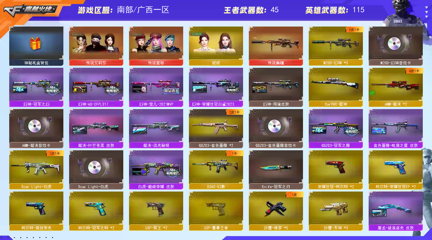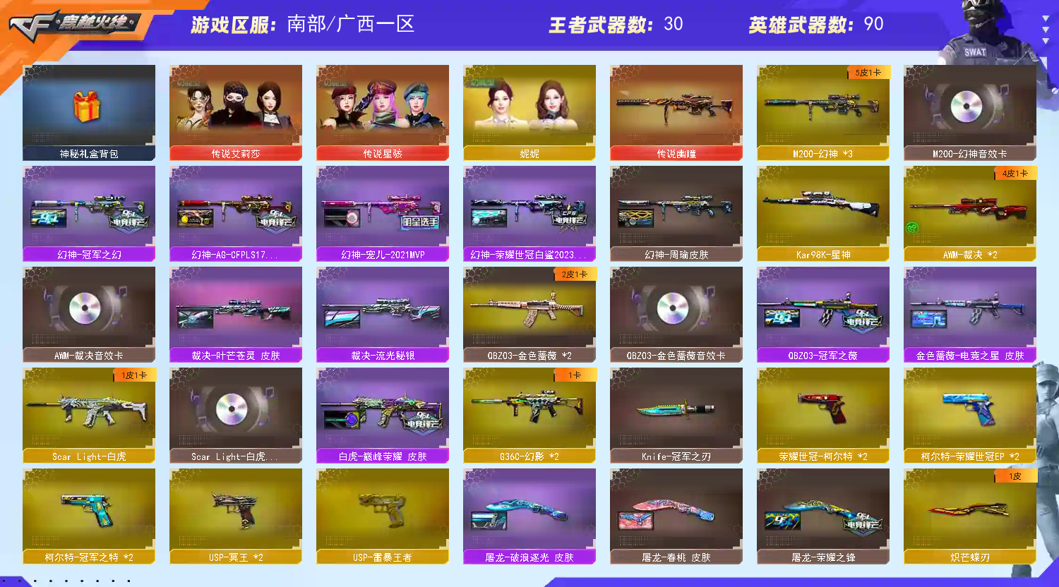 传说艾丽莎星骇妮妮+宠儿冠幻5p幻神带卡+4p裁决带卡+白虎QBZ三件套+10副手柯尔特ep冥王;USP-雷暴王者,荣耀世冠-柯尔特,柯尔特-冠军之特,炽芒蝶刃,Knife-冠军之刃,传说星骇,传说艾莉莎,