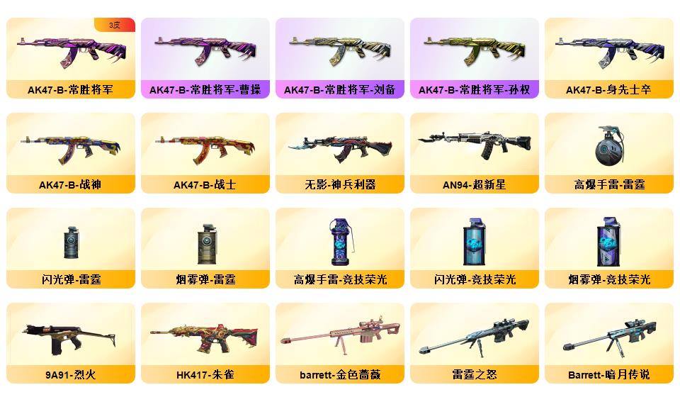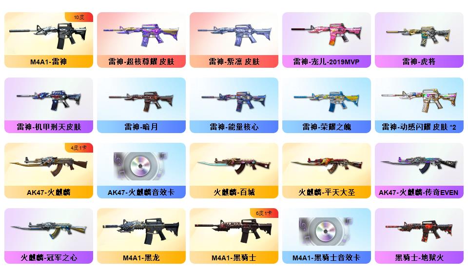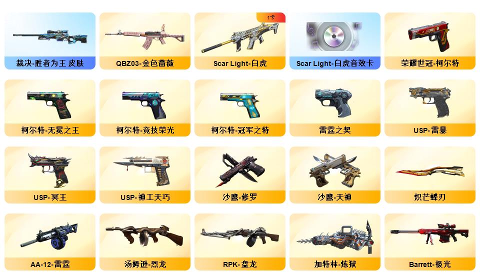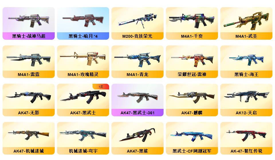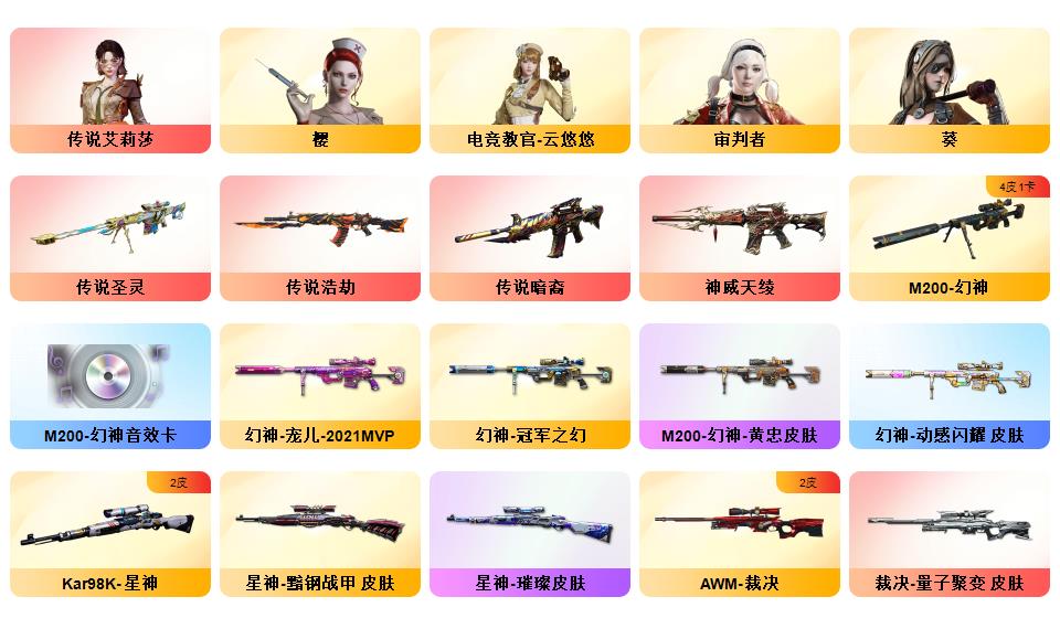 神威天绫,传说暗裔,传说浩劫,传说圣灵,4防传说艾莉莎 ,QBZ03-金色蔷薇*5,Scar Light-白虎,HK417-朱雀,M4A1-青龙,M200-幻神