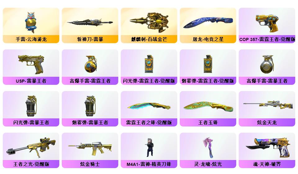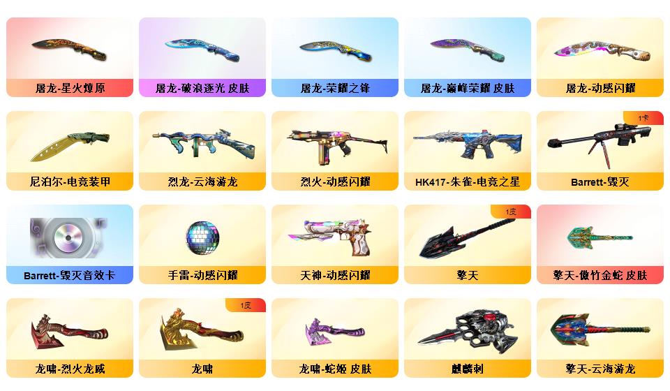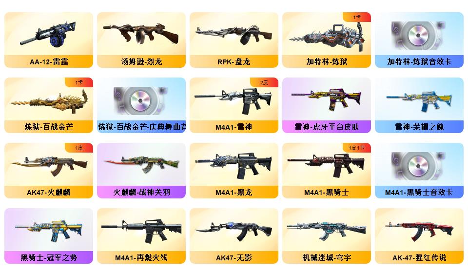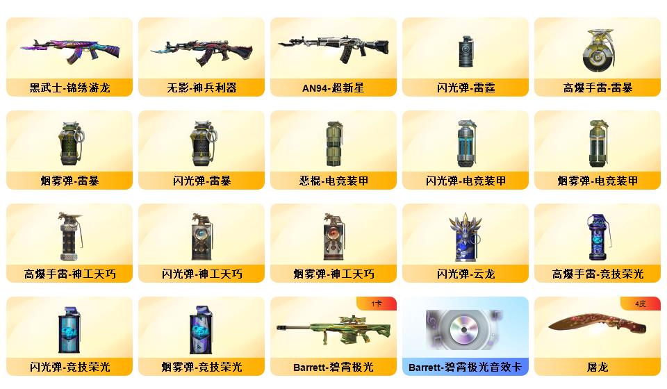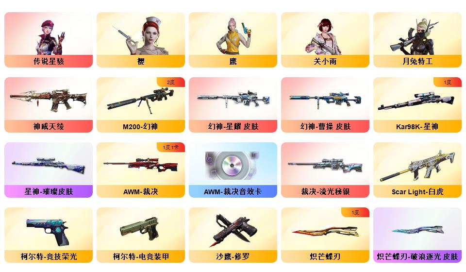 神威天绫,四防传说星骇,Scar Light-白虎,M200-幻神,金色蔷薇-古蛇迷踪,修罗-古蛇迷踪,死亡之眼*2,Kar98K-星神,M4A1-黑骑士*7,