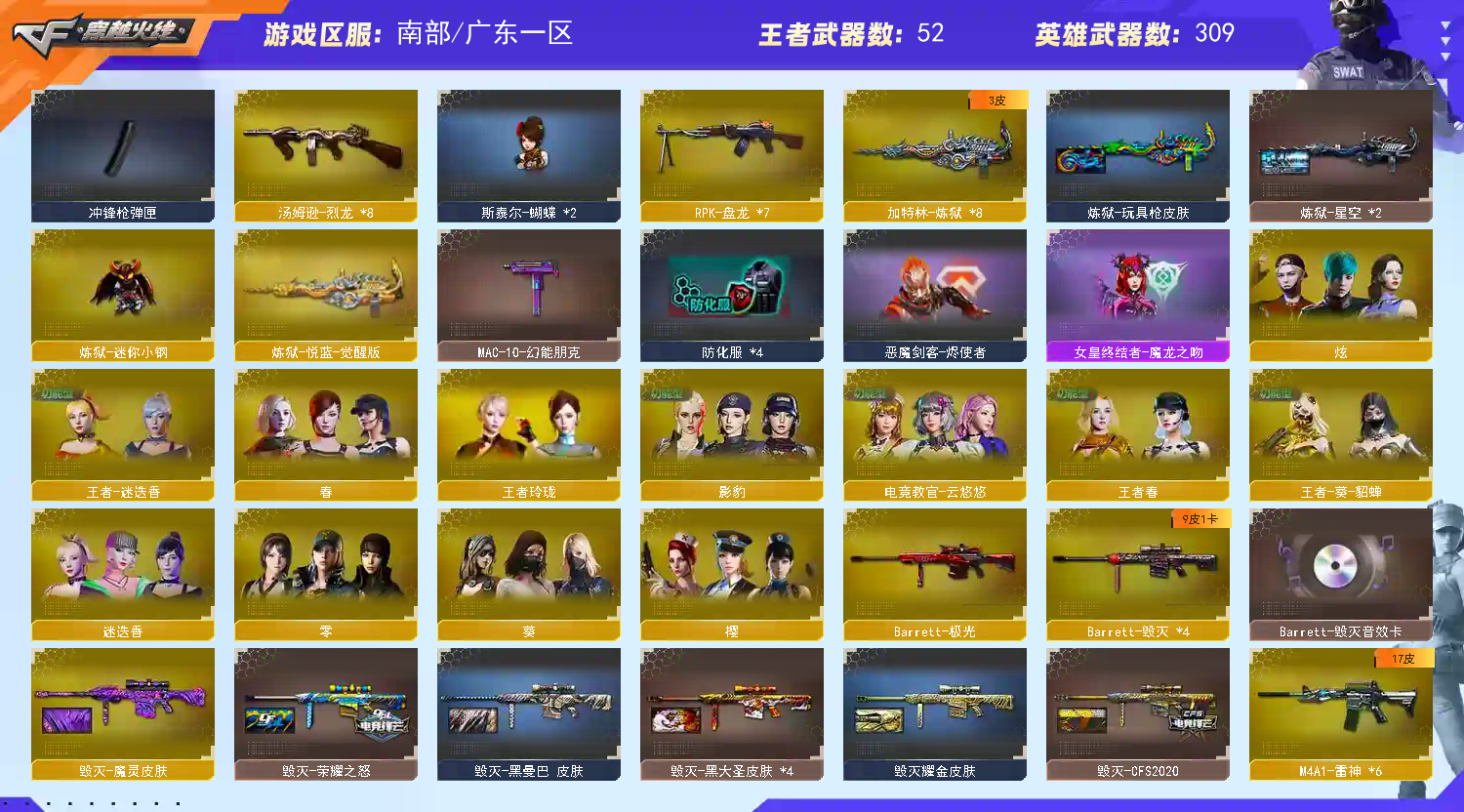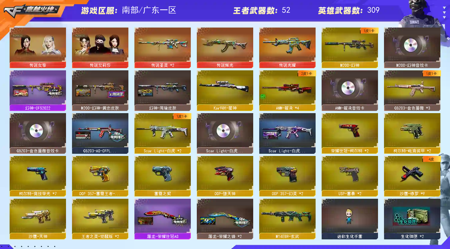 【四防传说女帝】【传说艾莉莎】【M200-幻神+音效卡+幻神-CFS2022+幻神-黄忠+幻神-周瑜】【竞技荣光套+四防云悠悠+usp雷暴】【Kar98K-星神】【王者幻神】【王者星神】【传说光耀(4315)】【传说辉光】【传说圣灵】【ScarLight-白虎+音效卡】【QBZ03-金色蔷薇+音效卡】【生化 6盘龙 6炼狱 6烈龙 迷你小钢 蝴蝶 死亡之眼 黄金猫猫手套白鲨】【裁决+音效卡】【Barrett-毁灭+音效卡+毁灭-荣耀之怒】【极光】【幻灵套】【雷暴套】【雷霆套】【AK47-火麒麟+音效卡+火麒麟-荣耀世冠ag+巅峰荣耀】【麒麟】【黑龙】【M4A1-雷神+音效卡+M4A1-雷神-荣耀世冠ag+雷神-宠儿+雷神-荣耀之魄+雷神-冠军之魄】【6黑骑士+音效卡+黑骑士-冠军之势】【王者之影 王者之魄 王者之势 王者冰魄 王者火魄 王者之城 王者之烈 王者风势 王者之怒 王者之光 王者之决 王者蔷薇】【无影 死神 黑武士 天启 超新星 机械迷城 黑鲨 龙血 玄武 玫瑰精灵 猎神 烈火】【32手枪 修罗*9 天神 cop雷霆 usp雷暴*2 cop堕天神 cop幻灵*2 竞技荣光*4 王者之灵*2 荣耀世冠-柯尔特*2 cop雷霆王者】【49近战 屠龙*7 龙啸*5 擎天 麒麟刺*3 斩神刀雷暴 幻灵之锋*5竞技荣光*7 云龙扇 王者之锋 王者之啸*2 王者之击*3 】【手雷 雷霆雷 雷暴雷 堕天神 夜魔雷 电竞装甲 幻灵雷 竞技荣光 神工天巧 雷霆王者 】【四防 影豹 王者春 王者葵貂禅 王者迷迭香 】【幻神音效卡 Barrett-毁灭音效卡 AK47-火麒麟音效卡 M4A1-雷神音效卡 黑骑士音效卡 ScarLight-白虎音效卡 qbz音效卡 裁决音效卡】;USP-雷暴,荣耀世冠-柯尔特,传说女帝,电竞教官-云悠悠,传说艾莉莎,RPK-盘龙,QBZ03-金色蔷薇,