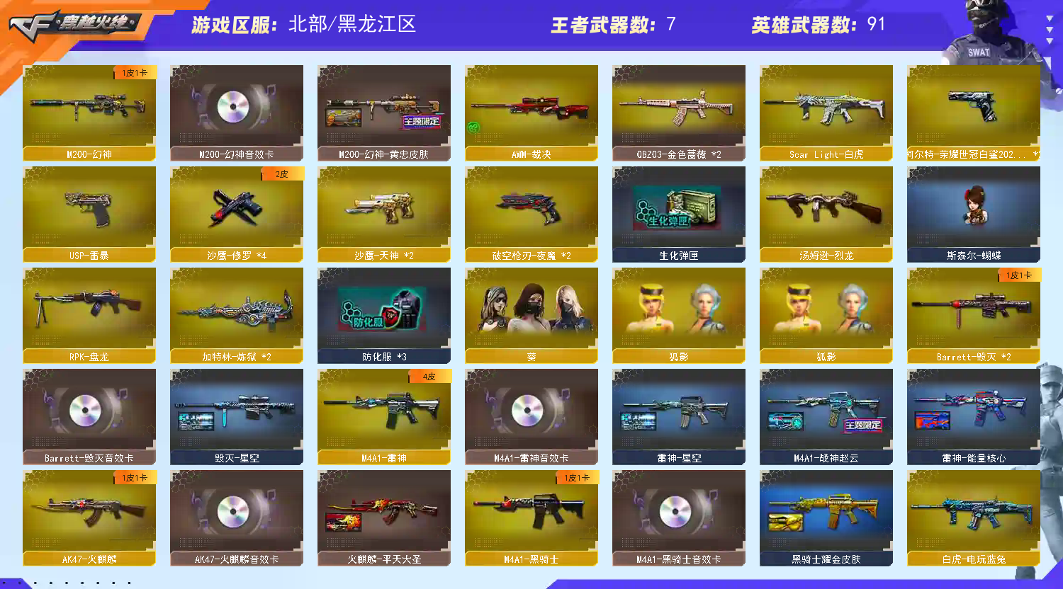 全装;USP-雷暴,柯尔特-荣耀世冠白鲨2023,RPK-盘龙,QBZ03-金色蔷薇,M200-幻神,Scar Light-白虎,