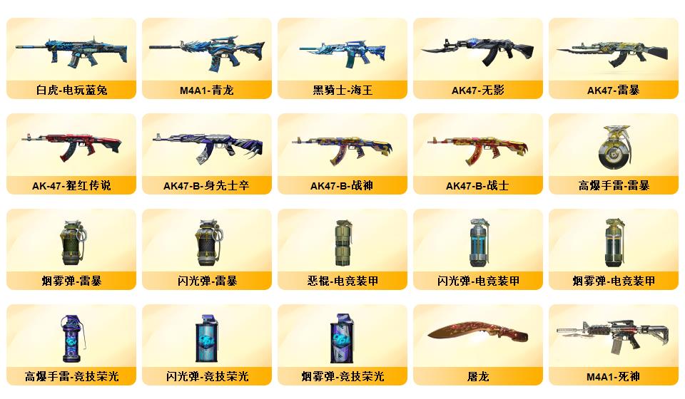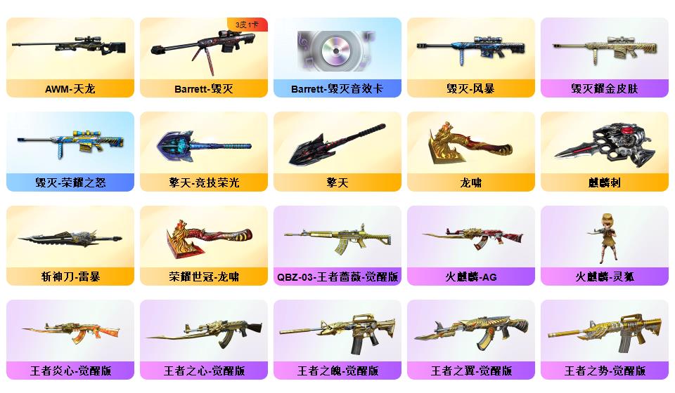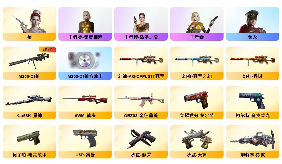 【穿越火线】 73V,幻神冠军之幻/幻神AG/幻神丹凤/毁灭荣耀之怒/毁灭耀金/毁灭风暴/天龙CFSTAR/天龙能量核心/火麒麟传奇EVEN/火麒麟CFSTAR/_樱/M200-幻神/Barrett-毁灭(2)/Kar98K-星神/AWM-天龙/AWM-裁决/雷暴套装/M200-幻神音效卡/M4A1-雷神音效卡/M4A1-黑骑士音效卡/AK47-火麒麟音效卡/Barrett-毁灭音效卡