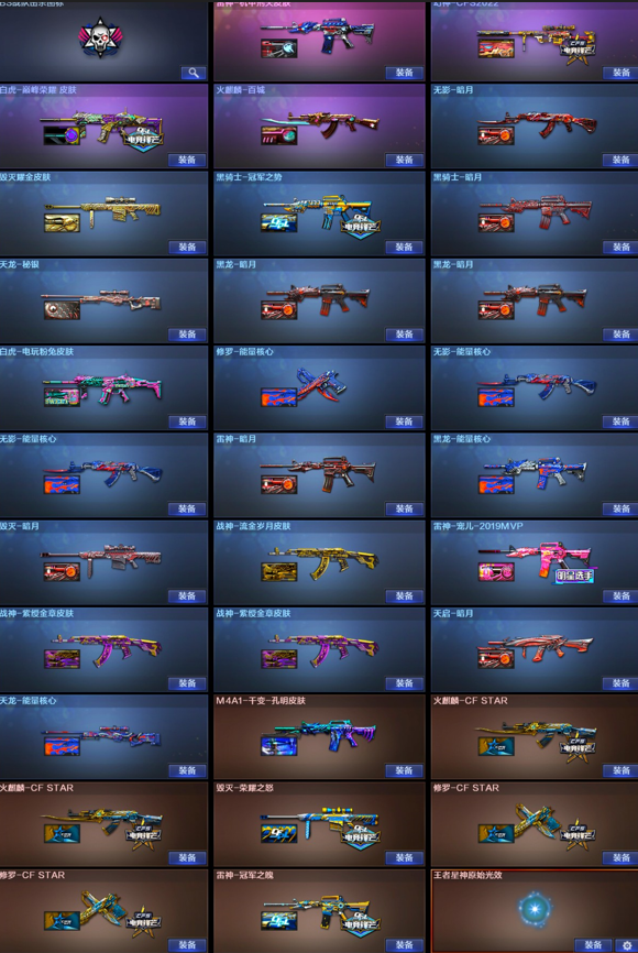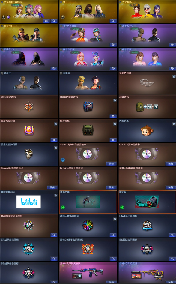 【稀有武器】:M200-幻神/ScarLight-白虎/HK417-朱雀/柯尔特-竞技荣光/USP-神工天巧/柯尔特-冠军之特/QBZ03-金色蔷薇/AK47-火麒麟/M4A1-黑龙/M4A1-雷神/M4A1-黑骑士(2)/AK47-无影/Barrett-毁灭(3)/加特林-炼狱/汤姆逊-烈龙/马来剑-夜魔 【王者武器】:王者之心-觉醒版/王者之光-觉醒版/王者星神-觉醒版/炼狱-悦蓝/王者之怒/王者之力/炼狱-悦蓝 【热门角色】:电竞教官-云悠悠/乔伊教练/王者-零/潘多拉-X/潘多拉 【热门音效卡】:Scar Light-白虎音效卡/M4A1-雷神音效卡/Barrett-毁灭音效卡/M4A1-黑骑士音效卡 【热门皮肤】:幻神-CFS2022/白虎-巅峰荣耀 皮肤/白虎-电玩粉兔皮肤/雷神-宠儿-2019MVP/毁灭-荣耀之怒/雷神-冠军之魄 【其他亮点】:贝雷塔687-射手座/哔哩哔哩名片;柯尔特-冠军之特,电竞教官-云悠悠,QBZ03-金色蔷薇,M200-幻神,Scar Light-白虎,