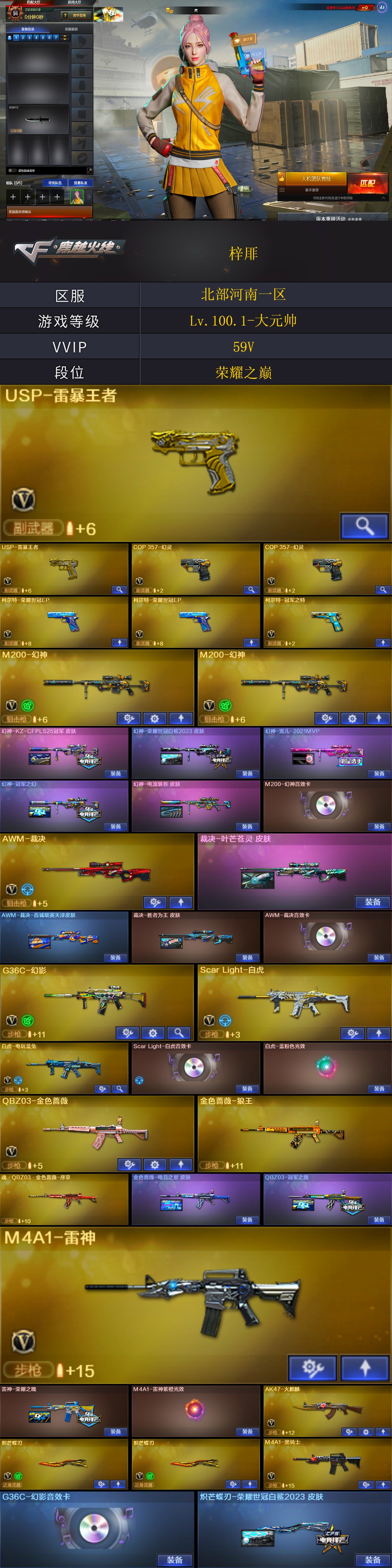 【商品标题】:北部河南一区-59V-可二次实名-【Lv.100.1-大元帅】-【段位:荣耀之巅】 【稀有武器】:M200-幻神(2)/G36C-幻影/ScarLight-白虎/COP357-幻灵(2)/柯尔特-冠军之特/QBZ03-金色蔷薇/AK47-火麒麟(2)/M4A1-黑龙/M4A1-雷神(3)/M4A1-黑骑士/白虎-电玩蓝兔/Barrett-毁灭(2)/AWM-裁决/炽芒蝶刃(2)/幻灵之锋 【王者武器】: 【热门角色】:鹰/王者-魅影/兔囡囡/潘多拉 【热门音效卡】:M200-幻神音效卡/AWM-裁决音效卡/Scar Light-白虎音效卡 【热门皮肤】:幻神-荣耀世冠白鲨2023皮肤/幻神-宠儿-2021MVP/幻神-冠军之幻/幻神-电流骇客皮肤/幻影-破浪逐光皮肤/屠龙-星耀皮肤/毁灭-HeartShot皮肤/QBZ03-冠军之薇/屠龙-破浪逐光皮肤/炽芒蝶刃-荣耀世冠白鲨2023皮肤/屠龙-荣耀之锋/毁灭-荣耀之怒/屠龙-春桃皮肤/雷神-荣耀之魄 【其他亮点】:烟雾弹-荣耀世冠白鲨2023 (截图展示段位不代表实际段位,如赛季更新等不可抗拒因素发生变化,其余道具看截图或咨询客服);USP-雷暴王者,柯尔特-冠军之特,炽芒蝶刃,QBZ03-金色蔷薇,G36C-幻影,M200-幻神,Scar Light-白虎,