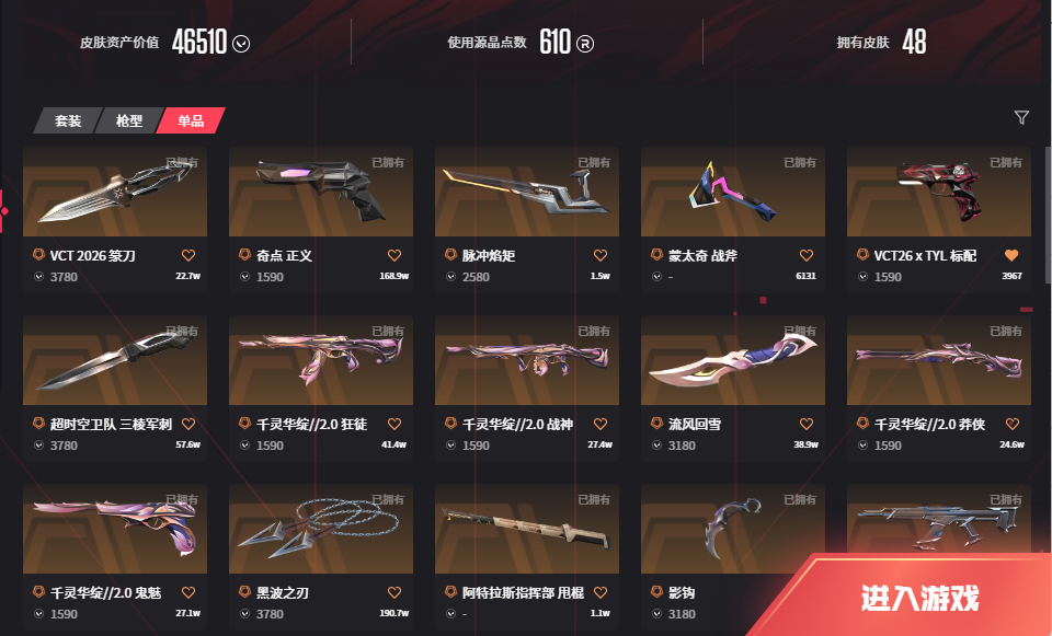 可排位马年套VCT2026篆刀千灵华绽2.0❤️三棱军黑波之刃影钩❤️塑水日冕雄狮紫金狂徒奇点正义