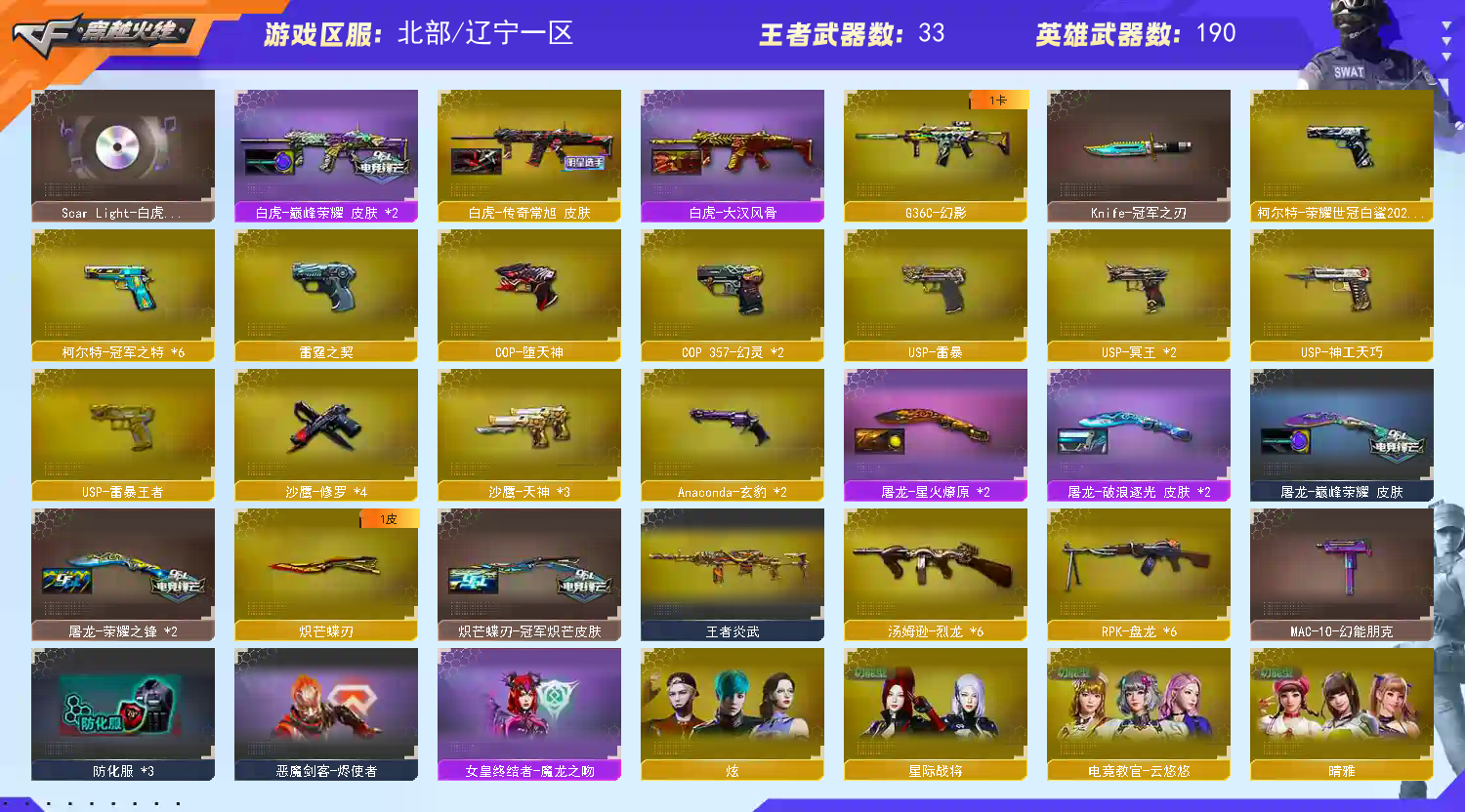 双神威金色礼盒幻神8皮三件套♥星神巅峰带卡裁决紫罗兰带卡白虎常旭qbz三件套天袭击幻影20副生化满配♥氪金10w多此号已经备案♥喜欢的老板收藏祝老板玩的开心;USP-雷暴,USP-雷暴王者,柯尔特-荣耀世冠白鲨2023,柯尔特-冠军之特,炽芒蝶刃,Knife-冠军之刃,电竞教官-云悠悠,