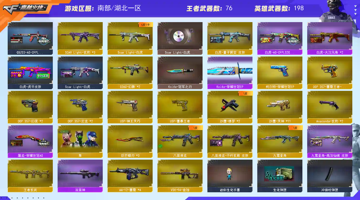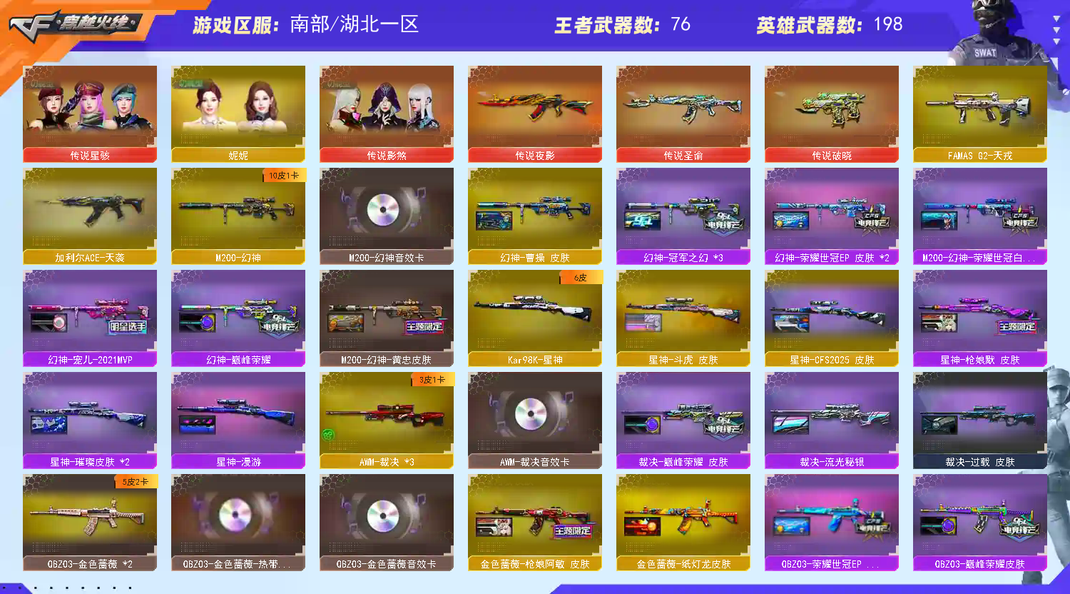 【传说武器】:传说夜影,传说圣谕,传说破晓【传说角色】:4防传说星骇,4防传说影煞【热门武器】:传说夜影,传说圣谕,传说破晓,G36C-幻影*2,QBZ03-金色蔷薇*2,Scar Light-白虎,HK417-朱雀*2,M4A1-青龙*2,M200-幻神,修罗-古蛇迷踪,八面凌龙,死亡之眼,青龙之魄*2,Kar98K-星神,金色小号,C.A.T,Cat-刀锋,牛牛-AK47,M4A1-黑骑士*5,汤姆逊-烈龙,RPK-盘龙,加特林-炼狱*5,金色蔷薇-空,斯泰尔-蝴蝶*2,降世魔童,毁灭-孙三炮,裁决-雪莉杨,火麒麟-绝迹,COP-白鲨*4,COP 357-幻灵*2,沙鹰-修罗*2,Knife-冠军之刃,炽芒蝶刃*3,金刚伞【王者炫金武器】:王者之势,王者火魄,王者青龙*2,王者凤吟,AK47-雷暴王者,青龙之魄*2,王者玄武,王者凌虎,王者之怒,Barrett-雷霆王者,王者星霆,王者之霆,USP-雷暴王者,王者之击,雷霆王者之锋,王者云击,斩神刀-雷暴王者,王者冰锋*2,王者之魄高爆手雷*2,王者之魄闪光弹*5,王者之魄烟雾弹,高爆手雷-雷霆王者*2,炫金火麒麟,炫金无影*2,炫金千变,炫金雷神,炫金超新星*2,炫金毁灭*2,炫金天龙【音效卡】:屠龙-动感闪耀 音效卡,天神-动感闪耀 音效卡,烈火-动感闪耀 音效卡,修罗-云海游龙音效卡,AN94-超新星-热带奇洋音效卡*2,QBZ03-金色蔷薇-热带奇洋音效卡,Scar Light-白虎-热带奇洋音效卡,M200-幻神音效卡,AK47-火麒麟音效卡,M4A1-雷神音效卡,M4A1-黑龙音效卡,M4A1-黑骑士音效卡,Barrett-毁灭音效卡,Barrett-毁灭-云海游龙音效卡,Barrett-极光音效卡,QBZ03-金色蔷薇音效卡,AWM-裁决音效卡,Scar Light-白虎音效卡,枪娘语音包-阿敏,HK417-朱雀音效卡,QBZ03-天罚音效卡*3,九霄圣角音效卡,火线妹语音包,女战神梧桐语音包【皮肤】:M200-幻神-黄忠皮肤,幻神-冠军之幻*3,幻神-宠儿-2021MVP,幻神-巅峰荣耀,M200-幻神-荣耀世冠白鲨,幻神-曹操 皮肤,幻神-荣耀世冠EP 皮肤*2,Scar Light-白虎-暗星,白虎-大汉风骨*2,白虎-AG-CFPLS20冠军,白虎-电玩粉兔皮肤,白虎-虎牙皮肤,白虎-量子聚变 皮肤,QBZ03-AG-CFPLS19冠军,金色蔷薇-枪娘阿敏 皮肤,金色蔷薇-纸灯龙皮肤,QBZ03-巅峰荣耀皮肤,QBZ03-荣耀世冠EP 皮肤,裁决-流光秘银,裁决-巅峰荣耀 皮肤,裁决-过载 皮肤,星神-璀璨皮肤*2,星神-枪娘默 皮肤,星神-漫游,星神-CFS2025 皮肤,星神-斗虎 皮肤,烈龙-星空,雷神-能量核心*2,雷神-虎将*3,雷神-耀金皮肤,M4A1-战神赵云,雷神-杨戬,雷神-R.LGD-CFPLS18冠军,雷神-荣耀世冠AG,雷神-维纳斯皮肤*2,雷神-动感闪耀 皮肤*2,M4A1-雷神-巅峰荣耀皮肤*2,雷神-云海游龙皮肤*3,雷神-海滩派对 皮肤,雷神-刘备 皮肤,火麒麟-华夏之心,火麒麟-轻羽皮肤,火麒麟-战神关羽,传奇石头-横秒之巅,火麒麟-平天大圣,火麒麟-白虎,火麒麟-虎牙平台皮肤,火麒麟-巅峰荣耀,火麒麟-大唐荣光,火麒麟-玉面羞花 皮肤,毁灭-荣耀之怒,毁灭耀金皮肤*2,毁灭-星空,巴雷特-虎牙平台皮肤,毁灭-冠军之怒,毁灭-战神张飞*2,毁灭-黑大圣皮肤,毁灭-直播专属,M4A1-千变-孔明皮肤,黑龙-墨子皮肤,黑龙-冠军之武*6,黑骑士耀金皮肤,黑骑士-地狱火,黑骑士-战神马超,黑骑士-CFS2021,黑骑士-AG-S4冠军典藏,黑骑士-电玩青兔皮肤,黑骑士-少林,黑骑士-破界 皮肤,无影-能量核心*2,AK47-黑武士-361,黑武士-典韦皮肤*2,八面凌龙-不朽玄君 皮肤,九霄圣角-高洁仙镜 皮肤,烈火-熔核皮肤,战神-流金岁月皮肤,玄武-幻灵装甲 皮肤,天龙-能量核心*2,极光-能量核心*2,炼狱-星空,炼狱-酷酷小狮,修罗-冠军之魂,屠龙-荣耀世冠AG,龙啸-冠军之啸*2,龙啸-纸灯龙皮肤,龙啸-巅峰荣耀 皮肤【角色】:雨棠,鹰,枪娘樱,4防隼,机械姬,妮妮,王者-瞳-闭月羞花,4防王者零-华冠丽服,4防王者-零-国色天香,4防王者炫,4防王者影豹,4防王者-迷迭香,蛇隐宗,暗夜审判,风暴女,嘉年华灵狐,灵动武士,4防灵狐者-职业经理,;USP-雷暴王者,炽芒蝶刃,Knife-冠军之刃,传说影煞,传说星骇,隼,妮妮,