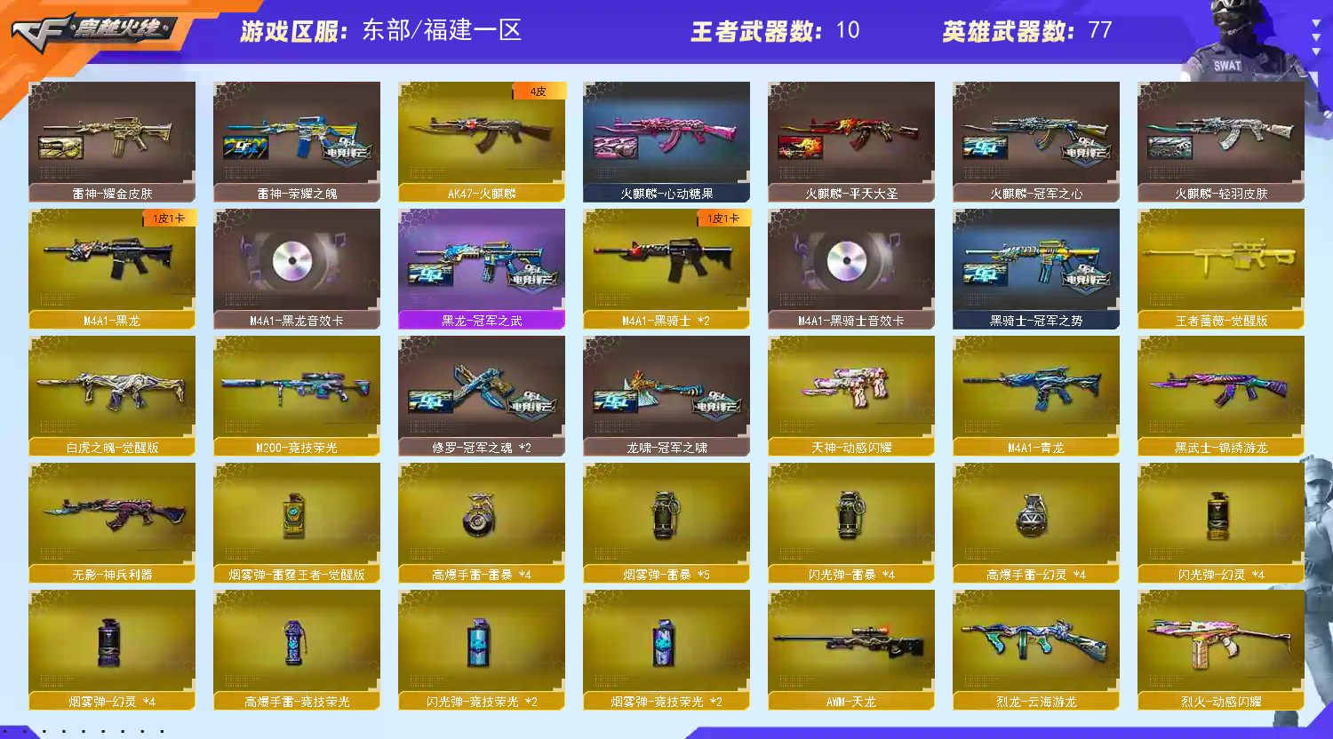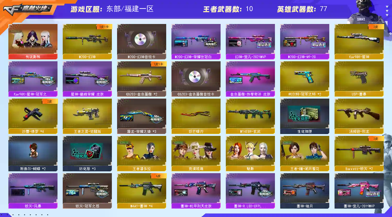 【幻神三皮三件套!!!】 【M200幻神+幻神音效卡+宠儿皮肤+N92022MVP皮肤+荣耀世冠白鲨皮肤+冠军之特+炽芒蝶刃+4防传说影煞】 【98k星神+冠军之星皮肤+巅峰荣耀皮肤+usp雷暴+4防荒漠琉璃】 【白虎+白虎之魄】 【qbz03金色蔷薇+金色蔷薇音效卡+热带奇洋皮肤】【竞技荣光套装】 【王者火魄 王者之武 王者蔷薇】 【雷神+雷神音效卡+CFPLS18冠军皮肤+荣耀之魄皮肤】 【火麒麟+冠军之心】 【黑骑士】【黑龙+黑龙音效卡+冠军之武皮肤】【毁灭+冠军之怒】 【青龙 玄武 无影神兵利器 锦绣游龙 热带奇洋 烈火动感闪耀 天龙 2烈龙】——【usp雷暴 冠军之特 沙鹰修罗 天神动感闪耀 王者之灵】——【炽芒蝶刃 屠龙 龙啸 麒麟刺 战神刀雷暴 擎天竞技荣光 屠龙动感闪耀 擎天云海游龙 龙啸热带奇洋 雷霆王者之锋 龙啸烈火龙威】——【雷暴投掷武器套装*4 幻灵投掷武器套*4 竞技荣光投掷武器套装】——【热门武器/小人枪】【毁灭孙三炮 cop白鲨 斯泰尔蝴蝶】——【角色】【4防(传说影煞 荒漠琉璃 王者潘多拉】【魅影 王者瞳闭月羞花】;USP-雷暴,柯尔特-冠军之特,炽芒蝶刃,传说影煞,QBZ03-金色蔷薇,M200-幻神,Kar98K-星神,