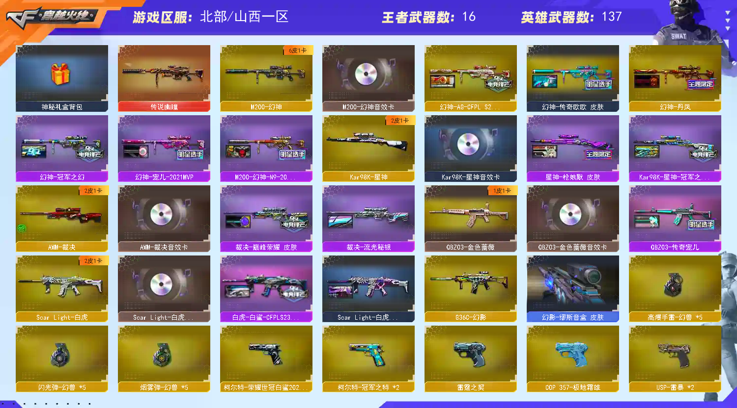 【北部山西一区】【传说幽瞳五套幻兽金名】【幻神欧欧新AG冠军之幻宠儿n9丹凤6皮三件套 星神冠军之星枪娘2皮三件套 裁决巅峰流光2皮三件套 白虎白鲨暗星2皮三件套 qbz宠儿三件套 G36C观影带皮 雷神荣耀之魄宠儿 毁灭6皮三件套】【2USP雷暴 USP冥王 COP雷霆 白鲨柯尔特 2冠军之特 USP雷暴王者 COP极地霜雄 炽芒蝶刃蝴蝶刀宋雨琦皮】【春 蝴蝶 关小雨 炫 王者春 王者鹰 神秘礼盒背包】;USP-雷暴,USP-雷暴王者,柯尔特-荣耀世冠白鲨2023,柯尔特-冠军之特,炽芒蝶刃,RPK-盘龙,QBZ03-金色蔷薇,