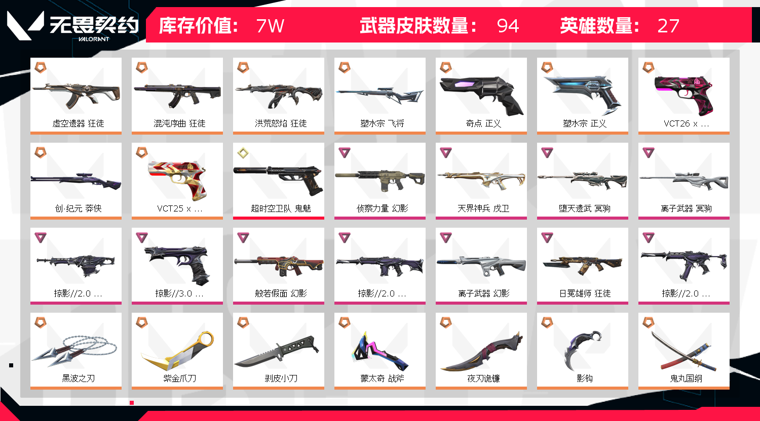 首页 > 租号大厅 > 无畏契约-wegame > wegame/wegame > 多刀皮,可排位,皮肤很多上号即可看见