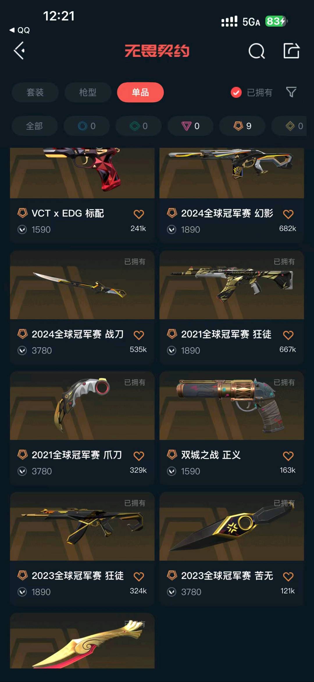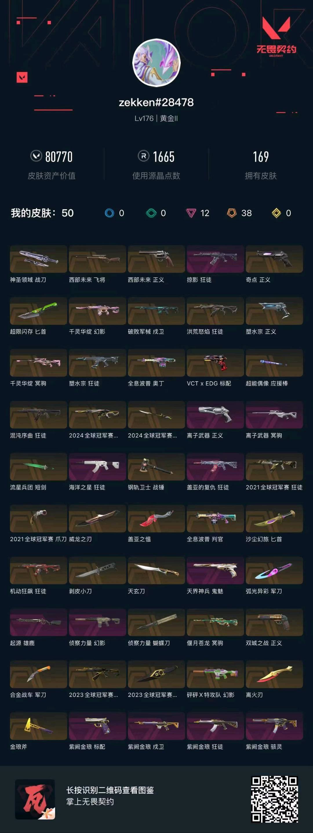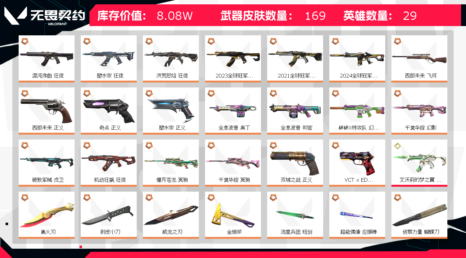 🏆 冠军赛限定系列(高保值收藏款) • 2021全球冠军赛:狂徒、爪刀(威龙之刃) • 2023全球冠军赛:全套系列(含近战、主武器) • 2024全球冠军赛:全套系列(含近战、主武器) • VCT x EDG标配:EDG联名限定,电竞情怀拉满 ⚔️ 高人气近战皮肤(手感&颜值双在线) • 神圣领域 战刀 • 千灵华绽 近战(幻影/冥驹双配套) • 侦察力量 蝴蝶刀(热门切刀皮肤,手感天花板) • 天玄刀、天界神兵 鬼魅、弧光异彩 军刀 • 沙尘幻旅 匕首、离火刀、金琅斧 • 超限闪存 匕首、流星兵团 短剑、剥皮小刀 🔥 热门主武器皮肤(竞技常用款) • 狂徒系列:掠影、洪荒怒焰、塑水宗、混沌序曲、海洋之星、盖亚的复仇、2021冠军赛、紫阙金琅 • 幻影系列:千灵华绽、侦察力量、砰砰X特攻队 • 戍卫系列:破败军械、紫阙金琅 • 骇灵系列:紫阙金琅 • 标配/判官:VCT x EDG标配、紫阙金琅标配、全息波普判官 • 冥驹系列:千灵华绽、离子武器、偃月苍龙 • 正义系列:西部未来、奇点、塑水宗、离子武器、双城之战;