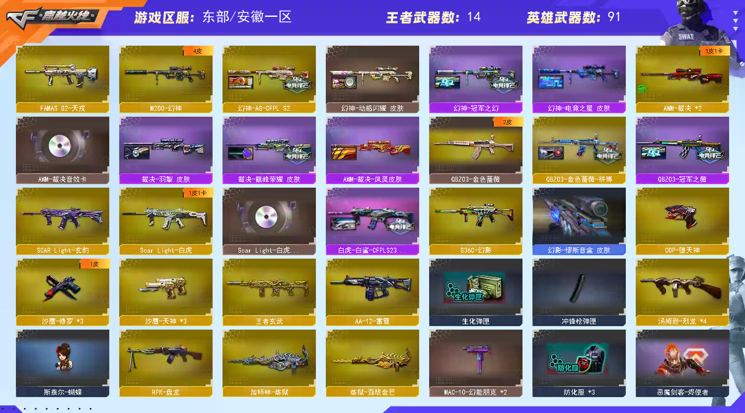 裁决三件套3皮肤 M200幻神带3热门皮肤】【热门武器 【M200-幻神+幻神-AG-CFPLS17+电竞之星+动感闪耀皮肤+幻神-冠军之幻】【裁决+裁决音效卡+巅峰荣耀+凤灵皮肤】【QBZ天罚+音效卡】【G36C幻影】【G2-天戎】【玄豹】【QBZ-独角】【ScarLight-白虎+音效卡+白鲨23冠军】【QBZ-03-金色蔷薇+缪斯音盒皮肤+冠军之薇】【QBZ-王者蔷薇】【王者玄武】【王者雷影】【火麒麟】【雷神】【黑骑士+音效卡】【毁灭+音效卡+冠军之怒皮肤】【盘龙+炼狱+烈龙+蝴蝶】【手枪 3修罗 3天神 COP堕天神】【刀具 尼布尔雷霆 幻灵之锋 屠龙-电竞之星】【雷暴王者手雷套*5】【小人枪 M82A1-不败狙神】【四防角色 机械姬 影豹 王者-春】【超级背包 炫彩背包;RPK-盘龙,QBZ03-金色蔷薇,G36C-幻影,M200-幻神,Scar Light-白虎,