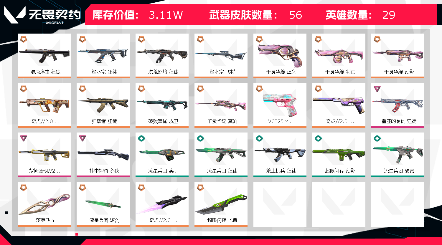 可排位 英雄28 武器皮肤数量55;盖亚的复仇 狂徒,洪荒怒焰 狂徒,混沌序曲 狂徒,塑水宗 狂徒,塑水宗 飞将,千灵华绽 正义,