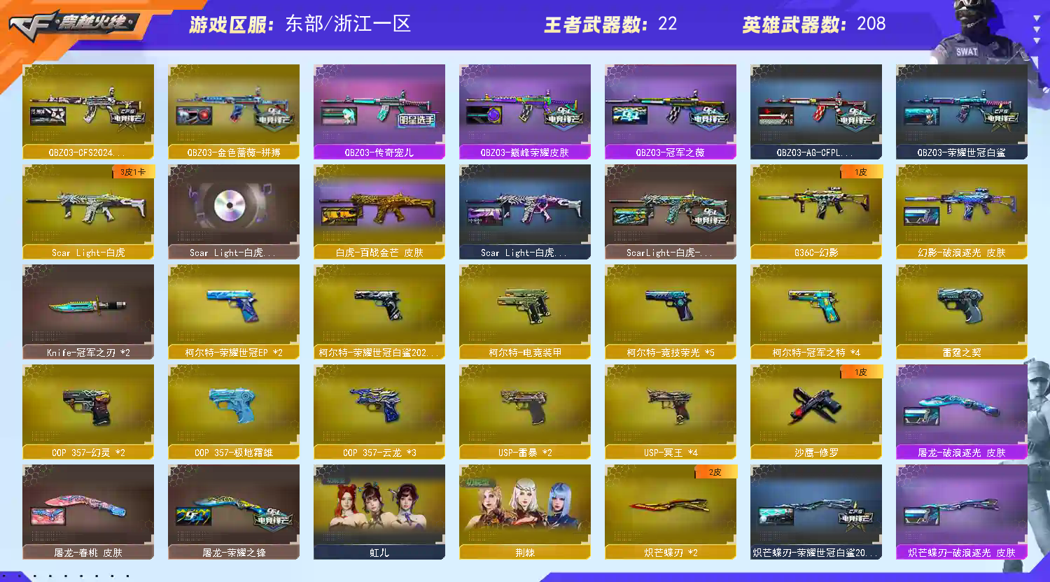 可排位房名打字 爆破生化双修号 牛逼皮肤牛逼手枪 传说女帝 虹儿生化属性全开 2镇魔喷子 6盘+炼狱 6烈+斯太尔蝴蝶+幻面灵狐 幽瞳+灵眸+辉光+暗裔+夜影+光耀(序列号0285) 幻神11皮宠儿+n9+欧欧+新老白鲨+新AG+电竞之星+电流+巅峰+2022+黄忠+卡 星神冠军+破竹+漫游+卡 裁决+流光+巅峰+运输船+胜者为王+卡 白虎百战+冠军+粉兔+暗星+卡 qbz宠儿+破浪+2024+巅峰+白鲨+ag+冠军+拼搏+卡 g36c 2蝴蝶刀 qbz柯基 3鲨臂 7cop+2usp+4usp冥王 4冠特+2冠刃+2ep特+白鲨特+5竞技荣光柯尔特 8套雷霆10套雷暴 东部无敌号;USP-雷暴,柯尔特-荣耀世冠白鲨2023,柯尔特-冠军之特,炽芒蝶刃,Knife-冠军之刃,传说女帝,电竞教官-云悠悠,