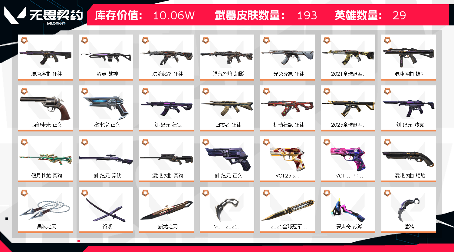 冻结秒解⚡11w库21冠军25冠军套黑波VCT爪源能者套镭切套光荣超时空混沌套般若机动塑水宗掠影洪荒;艾沃莉的梦之翼 奥丁,奇点 战神,黑波之刃,镭切,威龙之刃,VCT 2025 爪刀,起源 雄鹿,