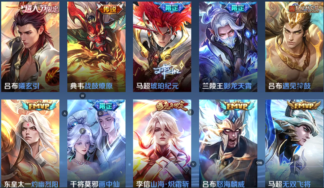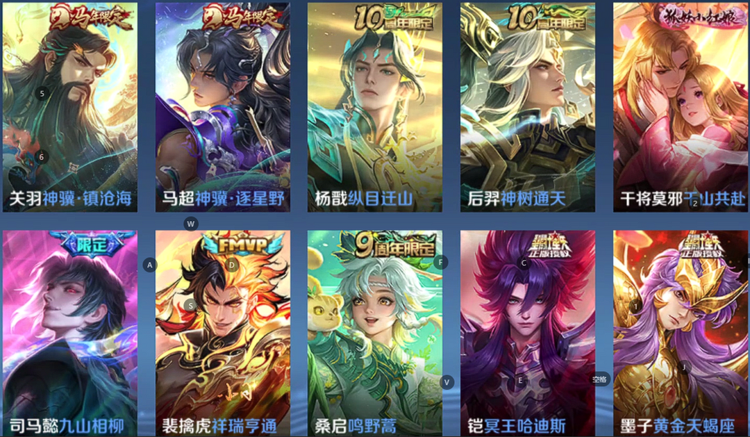 V10、550皮14水、吕布典藏-千魇归渊、云缨-神骥·越千峰、怪盗基德、伽罗星传说红枫、瑶典藏拾光映像、冥王哈迪斯、、龙年限定、齐天大圣